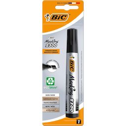 Le marqueur permanent BIC Marking 2300 ECOlutions est un feutre indélébile éco-conçu fabriqué avec 51% de matériaux recyclés (à l'exception du système d'encre). Il peut écrire jusqu'à 1 km et ne sèche pas même s'il reste décapuchonné pendant 1 mois. Disponible en 4 couleurs indémodables, il est idéal pour écrire sur la plupart des surfaces type cartons, plastiques, métaux, CD. Sa pointe biseautée très résistante permet de faire varier l'épaisseur des tracés entre 3,7 et 5,5 mm. Fabriqué en France.