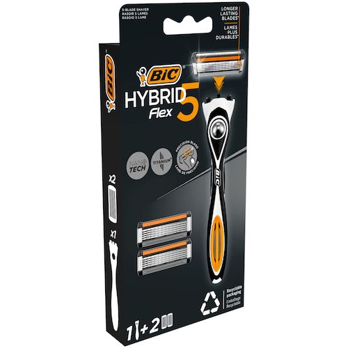 Rasoir homme BIC Hybrid 5 Flex et 2 têtes de rechange avec 5 lames mobiles nanotech avec revêtement en titane pour un rasage ultra-précisUtilisez la lame de précision du rasoir manuel pour le dessous du nez et du menton, les pattes et d’autres endroi