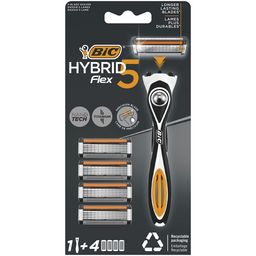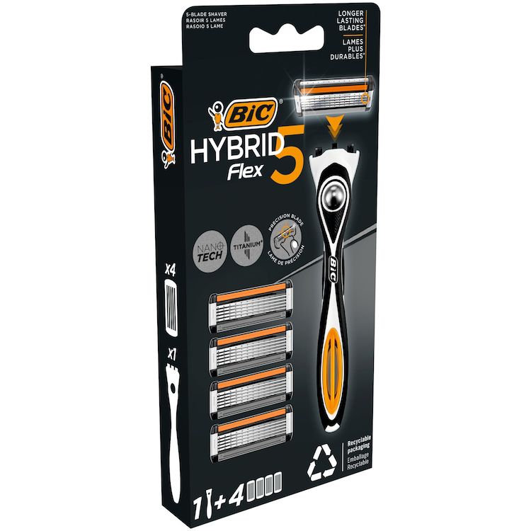 Rasoir homme BIC Hybrid 5 Flex et 4 têtes de rechange avec 5 lames mobiles nanotech avec revêtement en titane pour un rasage ultra-précisUtilisez la lame de précision du rasoir manuel pour le dessous du nez et du menton, les pattes et d’autres endroi