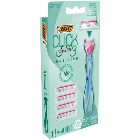 Ce rasoir pour femme à trois lames BIC Click 3 Soleil Sensitive se présente dans un kit recyclable avec 1 manche et 4 rechargesUn rasoir feminin doté d'un manche composé à 30 % de plastique recyclé pour réduire son impact écologiqueLa tête pivotante
