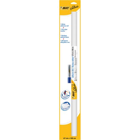 Le rouleau effaçable à sec BIC Velleda est une surface blanche adhésive de 67x100 cm fournie avec un marqueur bleu BIC Velleda 1781 à pointe biseautée, qui permet de moduler la largeur du trait. Il se découpe sur-mesure, à la taille de l'espace disponible. Passe-partout, il peut être collé sur chaqu