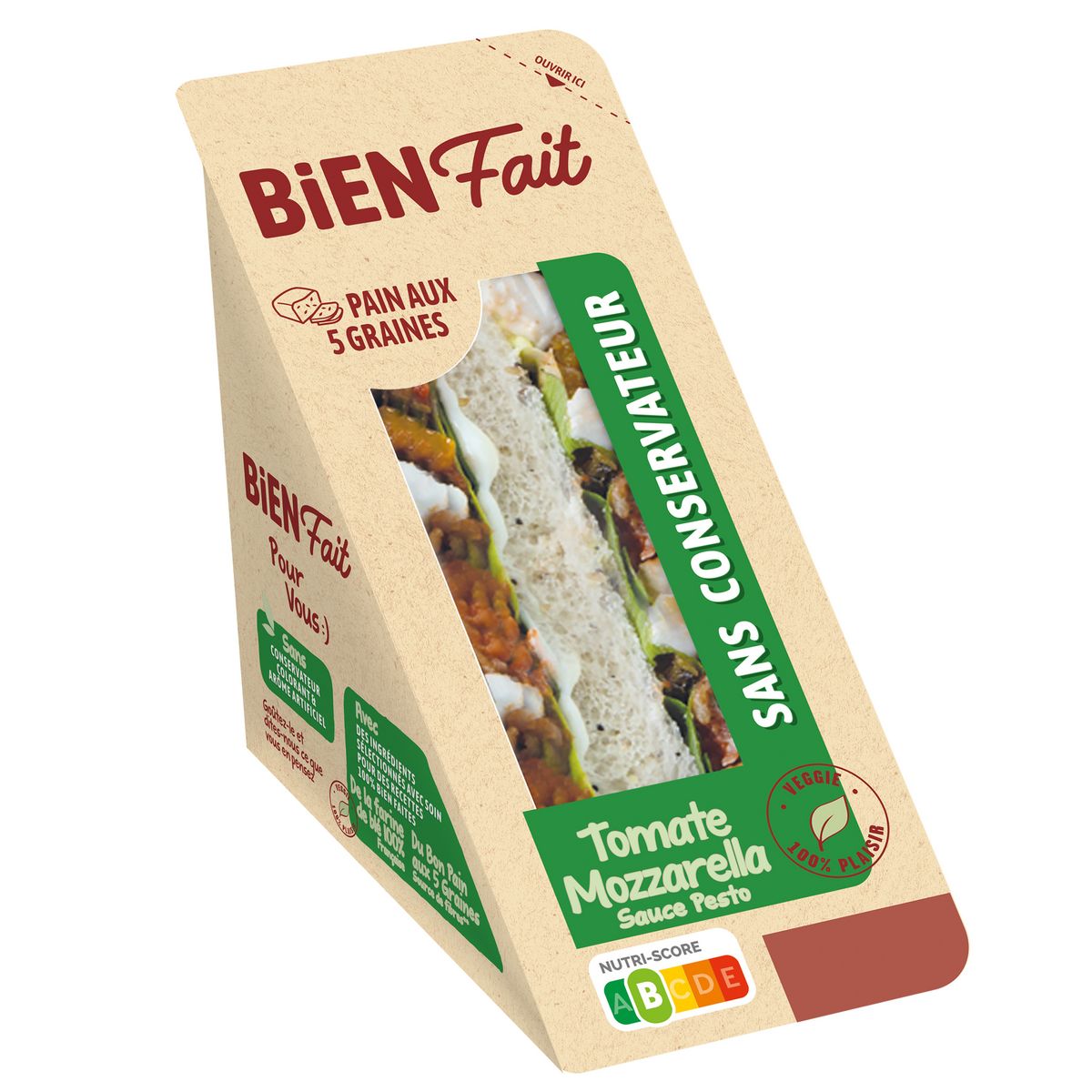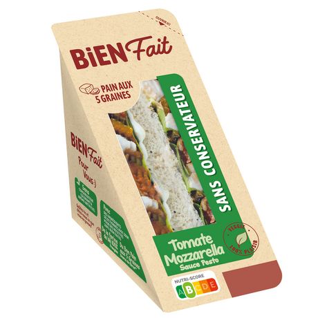 Ingrédients : Pain de mie cinq graines 50% (farine de blé 30%, eau, graines de tournesol 1.8%, huile de colza, sucre, levure, graines de lin brun 0.7%, graines de lin jaune 0.7%, graines de millet 0.7%, sel, graines de pavot 0.45%, graines de sarrasin 0.2%, gluten de blé), mozzarella française 16% (lait de vache pasteurisé, sel, ferments lactiques, coagulant), sauce au yaourt au pesto 16% [huile de colza, eau, yaourt 3.5%, vinaigre d’alcool, basilic 0.6%, amidon, jaune d’œuf, moutarde (eau, graines de moutarde, vinaigre d’alcool, sel), sucre, huile d’olive vierge 0.2%, sel, jus de citron concentré, parmesan 0.07%, épaississant : gomme guar, ail 0.01%, épice], salade, courgettes grillées 3%, tomate 3%, tomates mi-séchées assaisonnées 3% (tomates semi-déshydratées, huile de colza, sel, origan, ail). (% exprimés sur le produit fini)