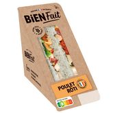 Ingrédients : Pain de mie cinq graines 50% (Farine de BLE 30,7%, eau, graines de tournesol 1,9%, huile de colza, sucre, levure, graines de lin brun 0,7%, graines de lin jaune 0,7%, graines de millet 0,7%, sel, graines de pavot 0,4%, graines de sarrasin 0,2%, GLUTEN de blé), viande de poulet rôti traité en salaison 18,8% (viande de poulet origine France, eau, dextrose, fécule de pomme de terre, sucre roux, arôme naturel, sel), sauce YAOURT et herbes 12,5% (huile de colza, eau, YAOURT 2.5%, vinaigre d'alcool, amidon, sucre, jaune d'OEUF, herbes de Provence 0.13%, sel, épaississant : gomme guar), tomates mi- séchées assaisonnées 6,3% (tomates semi déshydratées origine hors UE 5.9%, huile de colza, sel, origan, ail), tomate origine UE, salade. (% exprimés sur le produit fini)