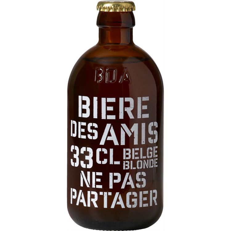 La Bière des Amis est brassée exclusivement à partir de matières premières de très haute qualité et une eau particulièrement pauvre en nitrate. Sa refermentation en bouteille lui confère son pétillant 100% naturel.