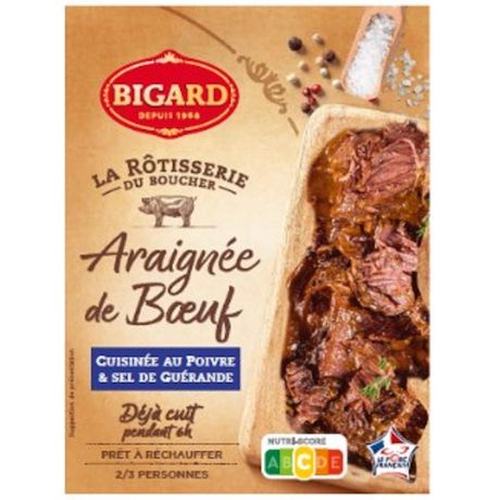 Ingrédients : Araignée de bœuf origine France 75%, huiles végétales en proportion variable (colza et sal), eau, texturant : amidon modifié de pomme de terre, fleur de sel de Guérande (0,5%), poivre noir 0,4%, poivre vert 0,2%, vinaigre d’alcool, extrait de poivre, arôme naturel.
