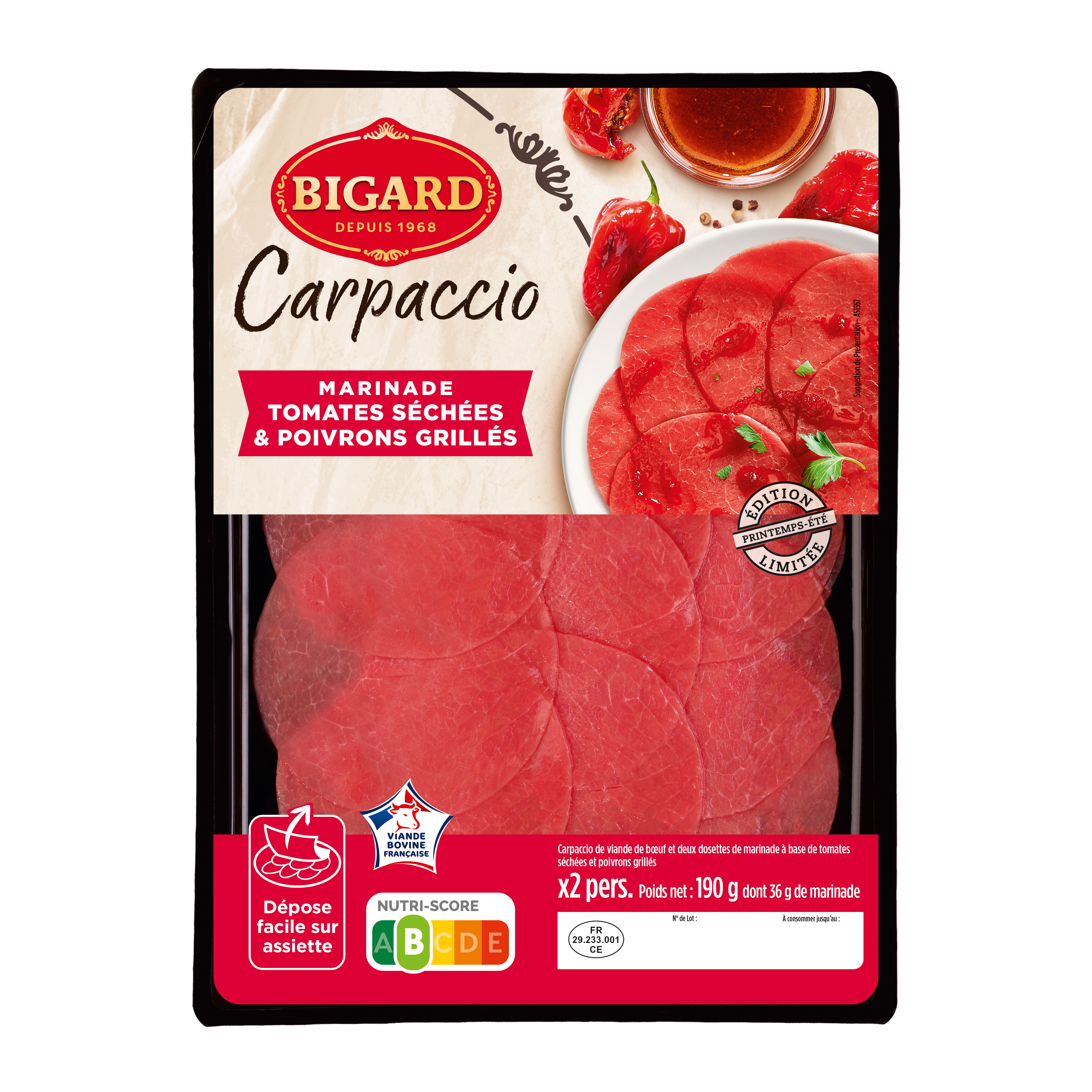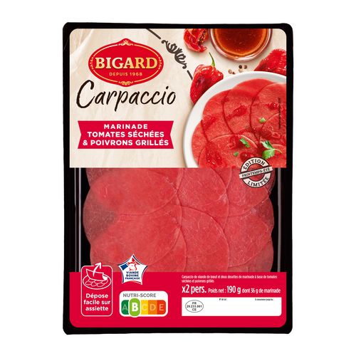 Carpaccio de viande de boeuf et deux dosettes de marinade à base de tomates séchées et poivrons grillés