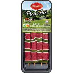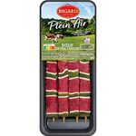 Ingrédients : Viande bovine 63% (origine France), poivrons, barde de lard (provenance UE), eau, arômes, sel, sirop de glucose, fibres végétales (bambou, citron, citron vert et pomme de terre),