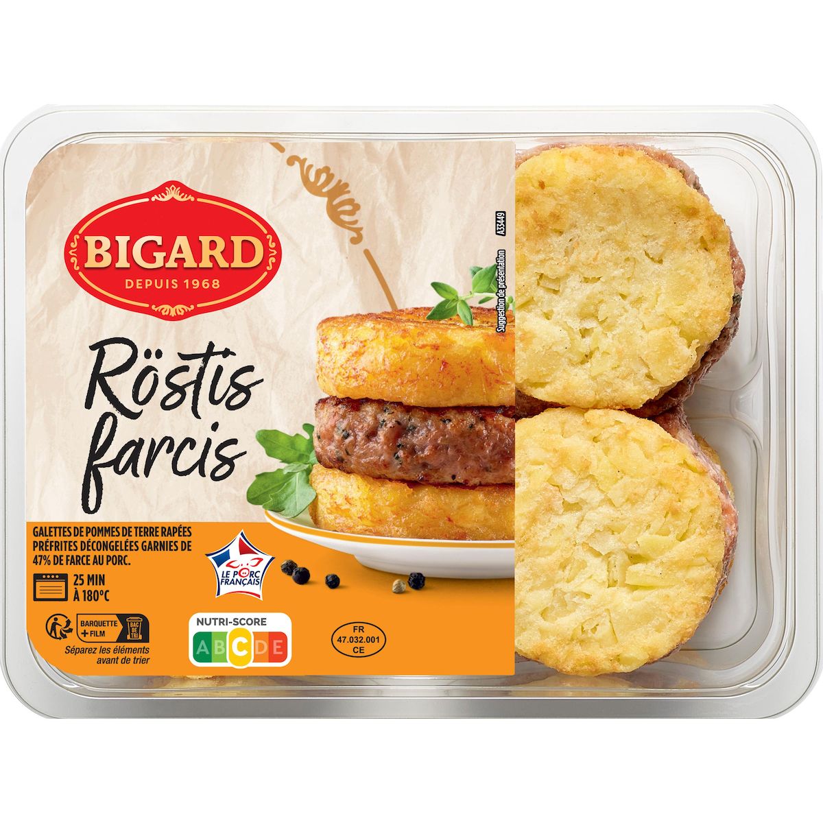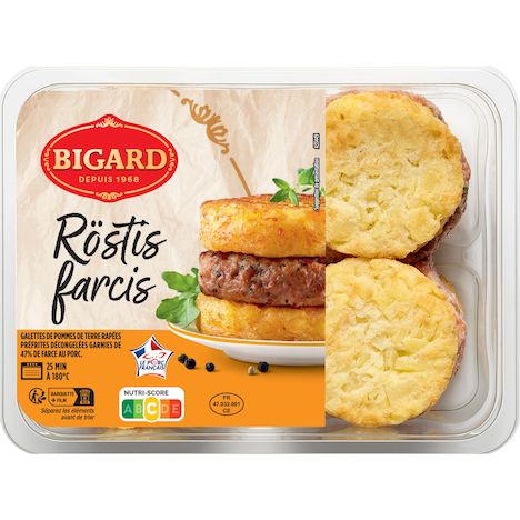 Galettes de pommes de terre rapées préfrites décongelées garnies de 42% de farce au porc