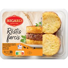 Ingrédients : Galettes de pommes de terre rapées préfrites décongelées 57% (pommes de terre 50%, huile de tournesol, pommes de terre déshydratées, sel, poudre d'oignon, poivre), viande de porc origine