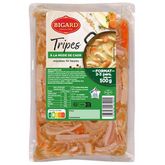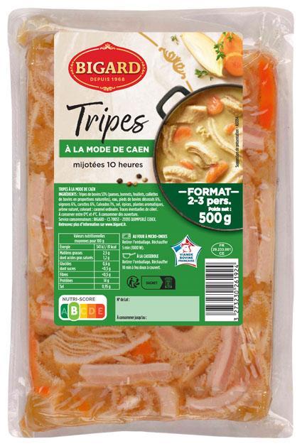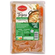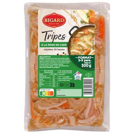 Ingrédients : Tripes de bovins 54% (panses, bonnets, feuillets, caillettes de bovins en proportions naturelles), eau, pieds de bovins désossés 9%, oignons, carottes, calvados 1%, sel, ail, épices, plantes aromatiques
