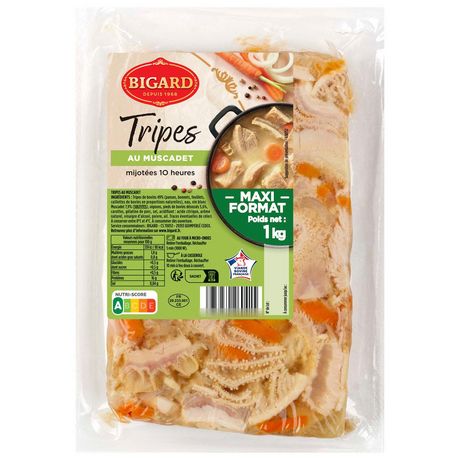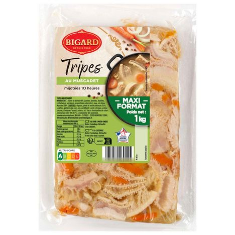 Ingrédients : Tripes de bovins 49% (panses, bonnets, feuillets, caillettes de bovins en proportions naturelles), eau, muscadet 7,9% (SULFITE), oignons, pieds de bovins désossés 5,6%, carottes, gélatines de porc, sel, vinaigre d'alcool, poivre, ail, dextrose, acidifiant : acide citrique, arôme