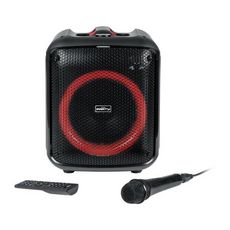L'enceinte est livrée avec un micro filaire de 2 mètres, idéal pour les sessions de karaoke. Un télécommande avec sons d'animation est également inclus, bien que les piles AAA nécessaires ne soient pas fournies. L'enceinte est compatible avec une alimentation secteur via un adaptateur de 18W fourni.