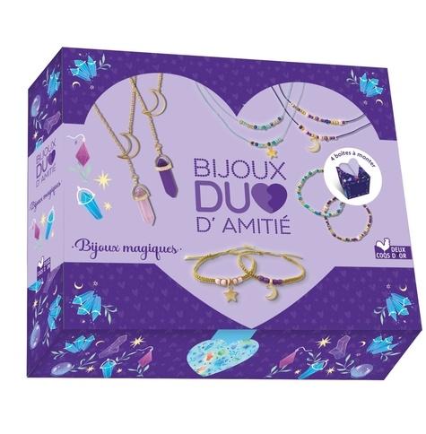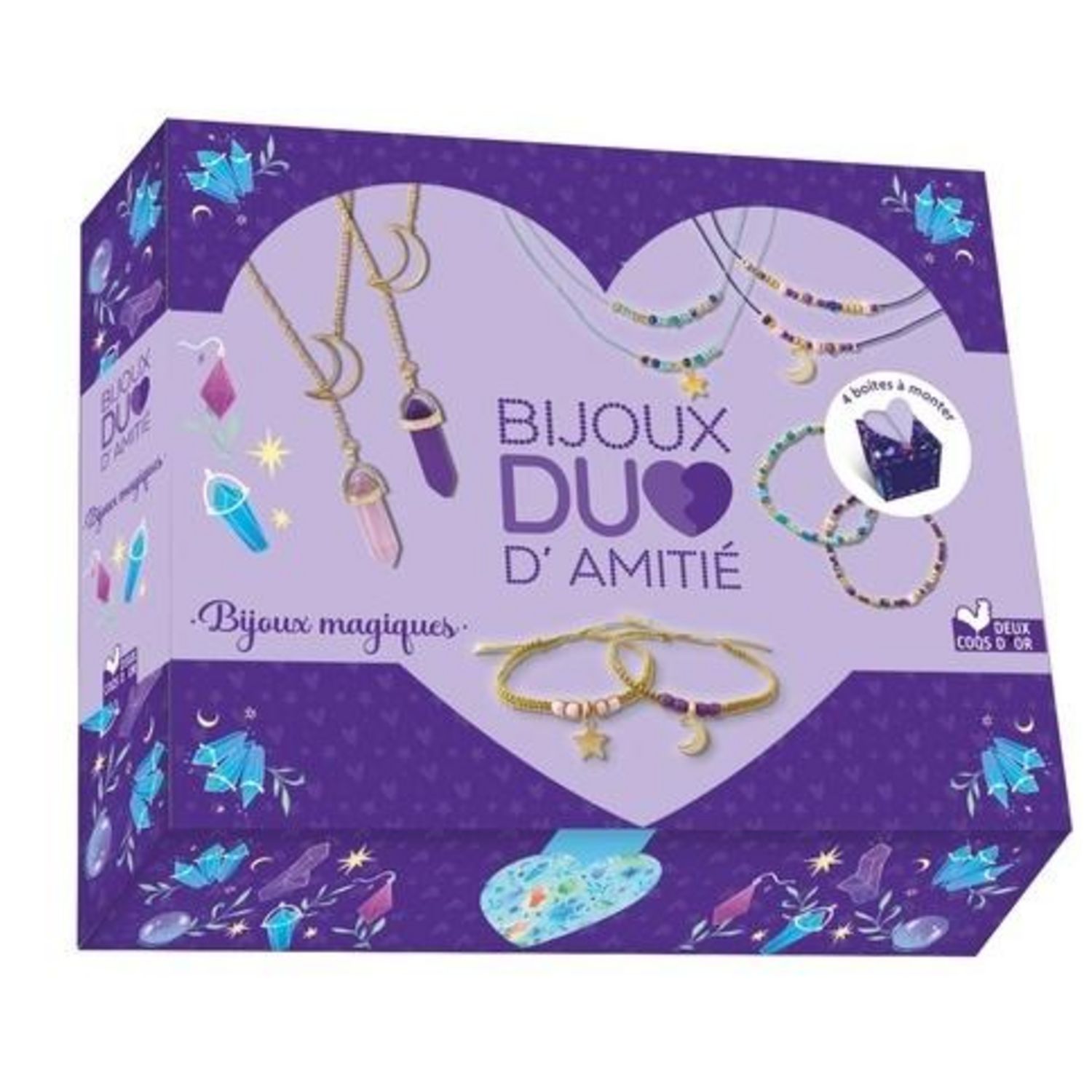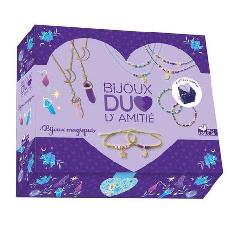 Un coffret contenant tout le matériel nécessaire à la création de 8 bijoux d'amitié, fonctionnant par paire (4 bracelets et 4 colliers), sur le thème des cristaux et bijoux magiques, accompagné d'un livret de 16 pages avec des pas-à-pas illustrés. L'un est à garder, l'autre est à offrir à son âme soeur. Ce coffret contient aussi 4 boîtes en papier, joliment illustrées, à compléter d'un petit mot puis à construire, pour y glisser son bijou à offrir. Un beau cadeau, réalisé entièrement par l'enfant et personnalisé. 2 colliers avec une chaîne dorée et un cristal en pendentif , 2 bracelets en macramé doré avec un cristal en pendentif , 2 colliers et 2 bracelets en double-rang composés de perles de rocailles et des breloques étoile et lune sur des fils de jade.
