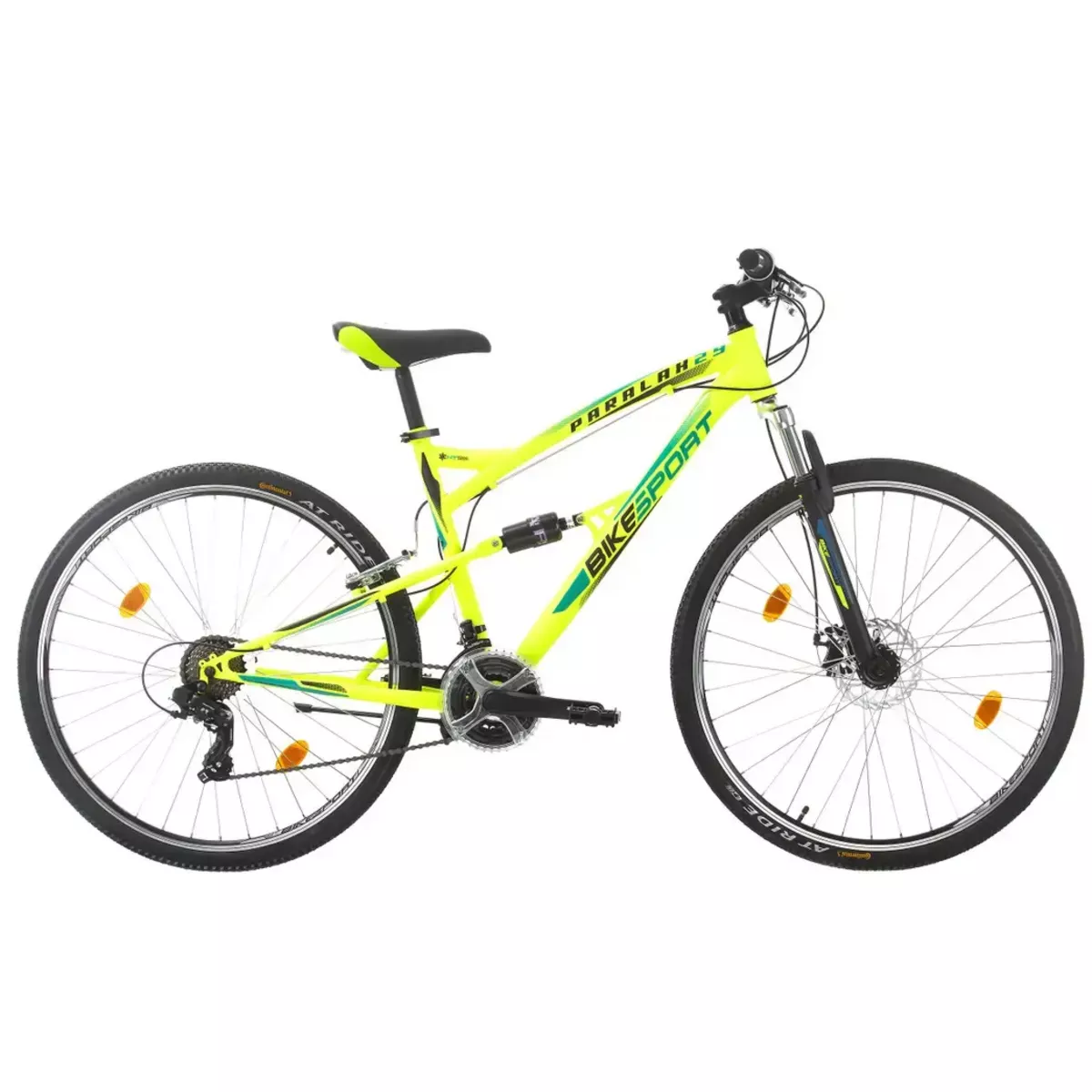 VTT 29'' Tout Suspendu avec cadre acier Suspendu de 483 mm (19''), Fourche Télescopique Zoom EN3816, 21 Vitesses via des poignées tournantes Microshift MS25, Dérailleur arrière Shimano RD-TY300 Tourney, Dérailleur avant Shimano TZ500, Roue libre Shimano 7 vitesses 14-16-18-20-22-24 et 28 dents, Freins avant à disque mecanique 160 mm, V-Brake acier à l'arrière avec étriers acier, Leviers de freins Power en aluminium, jantes en aluminium renforcées double parois, PotenceHeadset , Pneus noirs Kenda 700 x 50C ( 29 x 2.10 ), Tige de selle 28.6 x 250 x 1.4T réglable en hauteur via attache rapide, livré avec éclairages à leds fournis + marquage FNUCI !