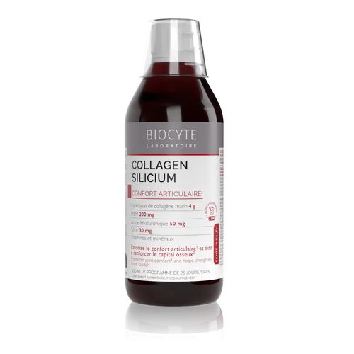 COLLAGEN SILICIUM est un complément alimentaire à base de silice, collagène, d’acide hyaluronique, de MSM, de vitamines et de minéraux avec édulcorants. Destiné aux personnes qui souhaitent améliorer le confort de leurs articulations, le Collagène Silicium Biocyte associe notamment, du bambou riche en silice organique qui favorise le confort articulaire, à de l’hydrolysat de collagène marin, de l’acide hyaluronique de 2 poids moléculaires différents, du manganèse qui contribue au maintien d’une ossature normale, ainsi que du MSM, du cuivre et des vitamines.