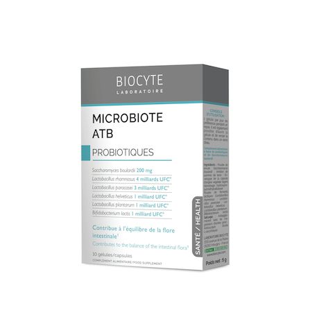 BIOCYTE MICROBIOTE ATB est un complément alimentaire à base de ferments lactiques et de la levure Saccharomyces boulardii dosée à 200 mg pour soutenir et protéger la flore intestinale endommagée lors d’une prise d’antibiotiques.