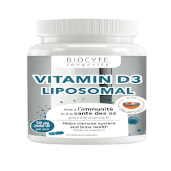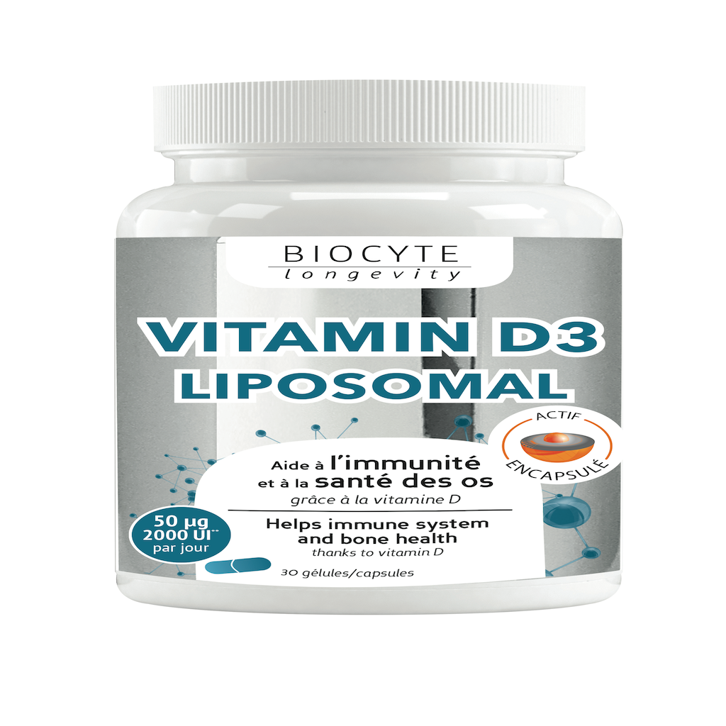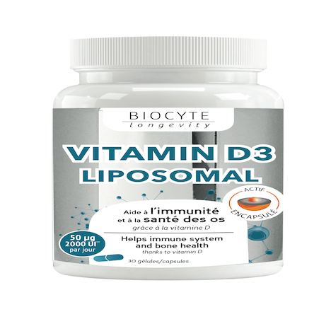BIOCYTE VITAMIN D3 contribue à une ossature normale grâce à vitamine D. Elle contribue également à une calcémie normale. Première vitamine D liposomée pour une biodisponibilité améliorée.