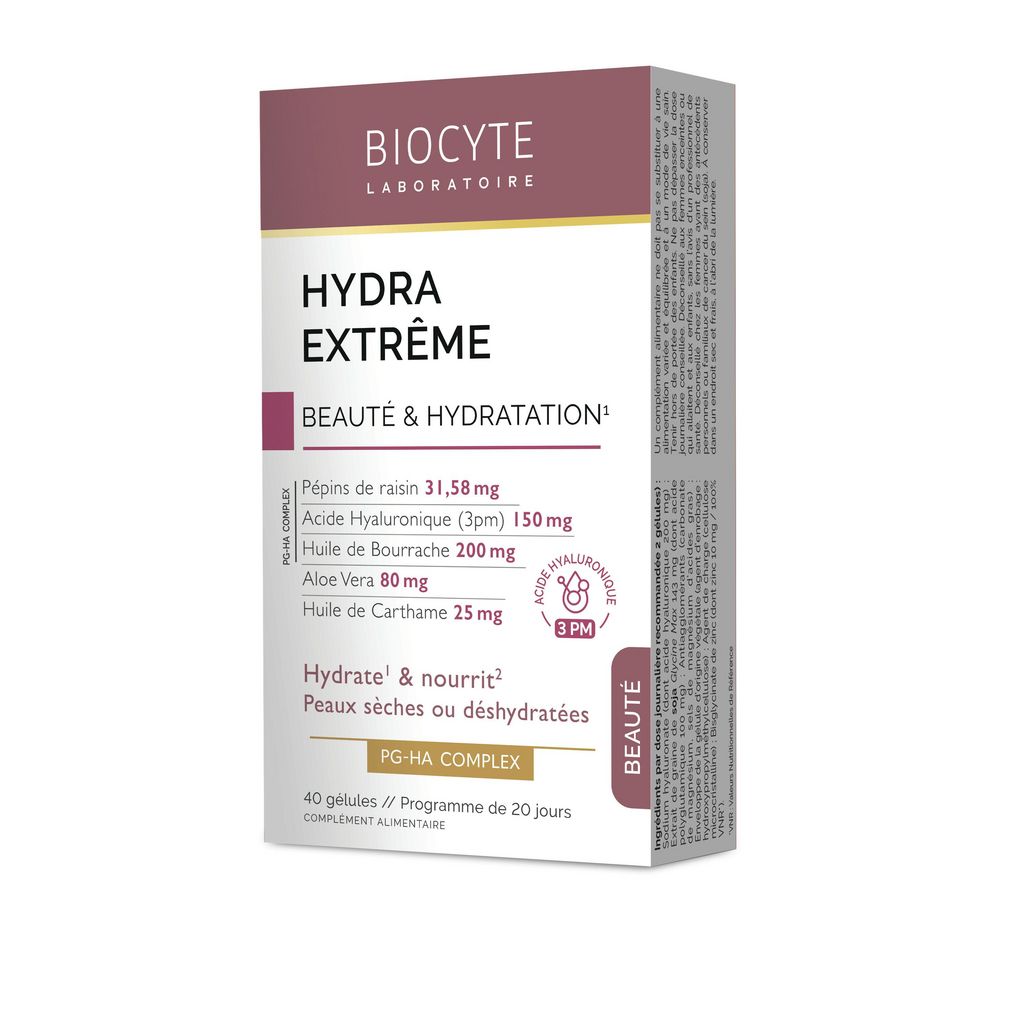 Expert en nutricosmétique, le Laboratoire Biocyte a mis tout son savoir-faire à travers sa dernière innovation Hydra Extrême afin de réhydrater et nourrir la peau en profondeur. Sa formule unique associe : Pépins de raisin, Acide Hyaluronique, Huile de Bourrache, Aloe Vera et Huile de Carthame.
