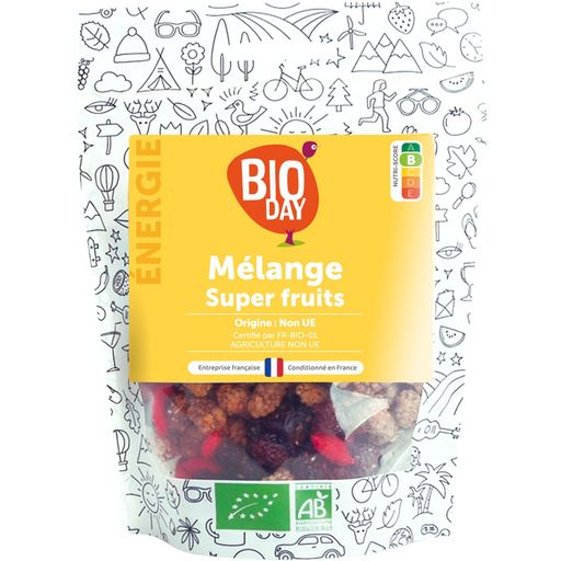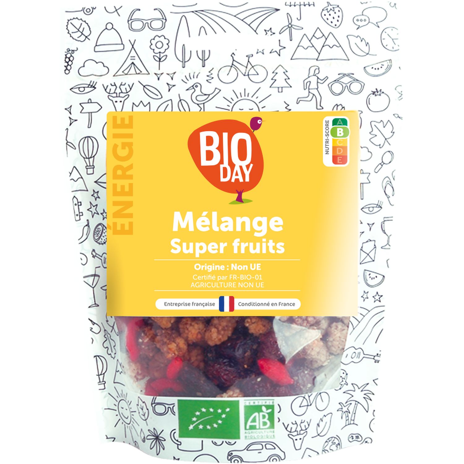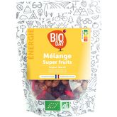MÉLANGE SUPER FRUITS BIO 125G Reconnus pour leurs qualités nutritionnelles, les super fruits sont un allié de choix pour une alimentation saine et gourmande. Le mélange super fruits Bioday est composé de mûres blanches, cranberries, baies de goji et myrtilles.