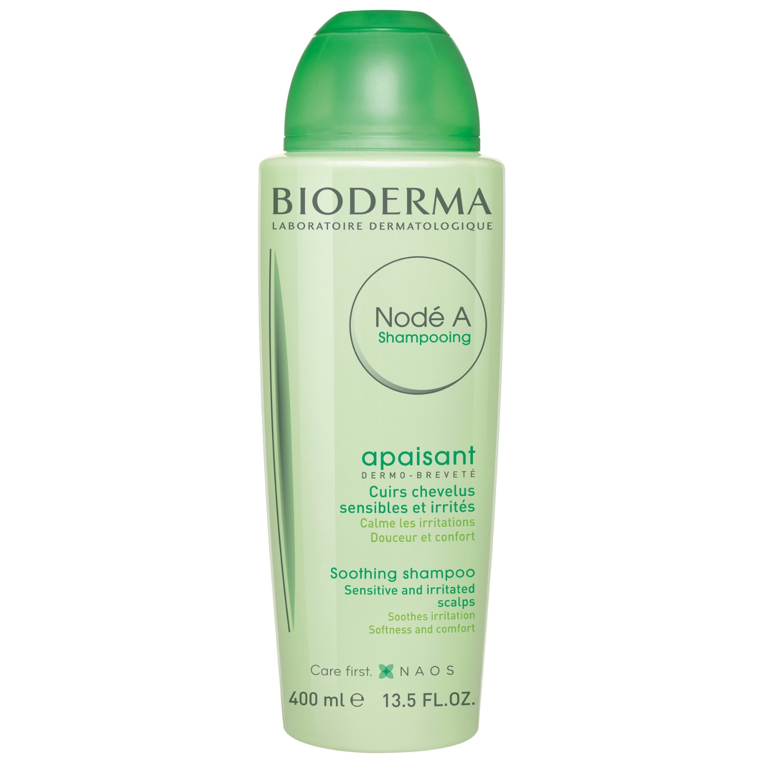 Le shampooing apaisant cuir chevelu sensible et irrité, Nodé A par Bioderma, calme les irritations et apporte douceur et brillance aux cheveux. Ce produit est formulé et fabriqué en France.