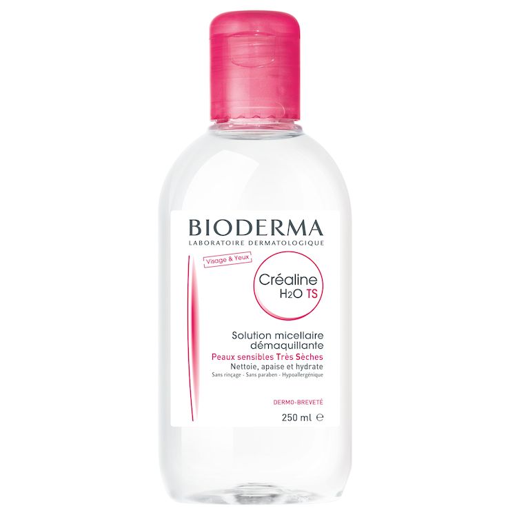 Eau micellaire Créaline H2O TS, formulée pour les peaux sensibles très sèches. Démaquille, nettoie et purifie la peau sans agresser. Ce produit est formulé et fabriqué en France.