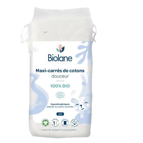 Les maxi carrés de cotons certifiés biologiques Biolane permettent de nettoyer en douceur votre bébé. Ils sont adaptés à leur peau sensible.