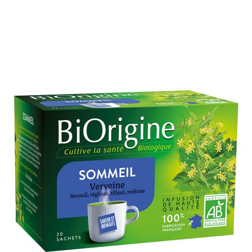 Les plantes de cette infusion BiOrigine sont associées pour leurs vertus ou leurs qualités gustatives. Nous n'ajoutons pas d'arômes, la saveur naturelle de cette infusion se crée par un juste équilibre entre les plantes. La verveine favorise naturellement la venue du sommeil. Le fenouil et la réglisse facilitent la digestion pour une nuit plus sereine. Biorigine - Tisane Sommeil - 20 sachets