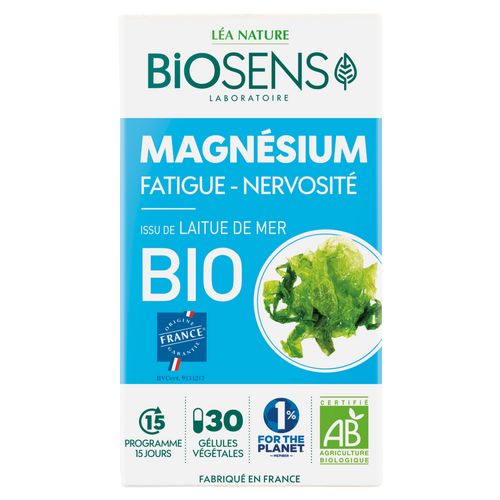 Laitue de mer Ulva lactuca Véritable source de magnésium Magnésium Aide à réduire la fatigue Contribue à des fonctions psychologiques normales Contribue au fonctionnement normal du système nerveux Le magnésium est un des minéraux indispensables à la vie. Un déficit en magnésium peut être associé à de la fatigue et de la nervosité passagère. Expert des bienfaits de la nature et des plantes, BIOSENS a sélectionné pour vous une laitue de mer BIO récoltée dans son environnement naturel marin, véritable source de magnésium qui aide à vous détendre et en cas de fatigue. Cette gélule hautement dosée est composée uniquement d'algue et d'ingrédients d'origine naturelle. Sans dioxyde de titane - conformément à la réglementation biologique Pilulier d'origine végétale Vegan Fabriqué en France Formule BIO Origine France Garantie