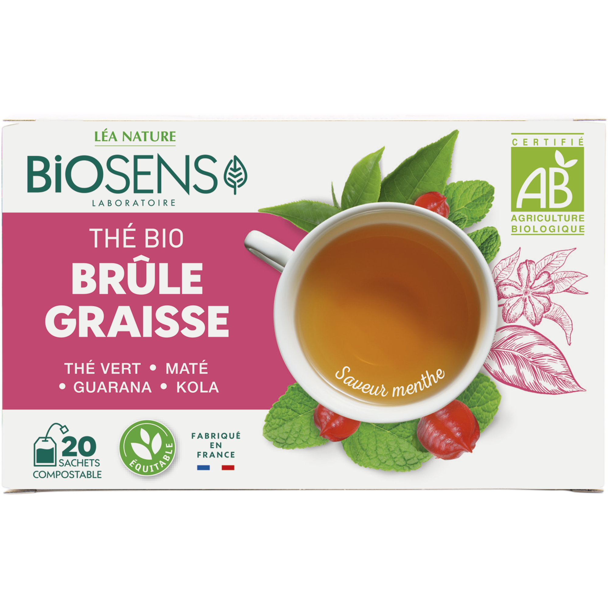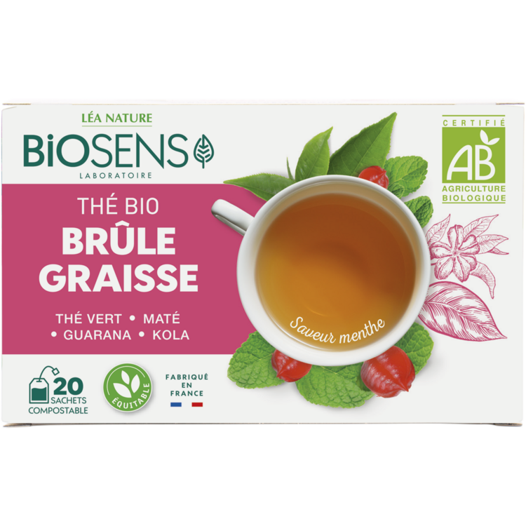 BIOSENS Thé Brûle Graisse 20 sachets compostables Prenez le temps d'une pause avec le thé BIOSENS Brûle Graisse délicatement aromatisé à la menthe pour une action ciblée. Le thé vert Chun Mee se caratérise par ses petites feuilles fines et régulières à la saveur douce et fleurie. Provenant de Chine, il possède de nombreuses propriétés. BIOSENS associe ce thé vert hautement qualitatif à 3 plantes actives pour aider à la combustion des graisses stockées. Thé vert : reconnu pour favoriser l'élimination de l'eau et favorise la dépense énergétique. Guarana : favorise la combustion des graisses. Maté : aide à contrôler et à maintenir son poids de forme. Kola : aide à contrôler et à maintenir son poids de forme. Fabriqué en France Sachets compostables Film compostable BIOSENS reverse 1% de son chiffre d'affaire à la protection de la planète. BIO Saveur Menthe