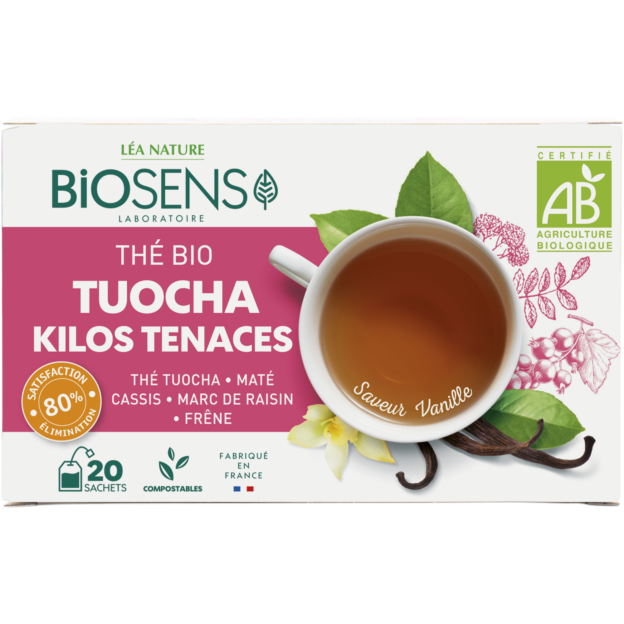 BIOSENS Thé Tuocha Kilos Tenaces 20 sachets compostables Prenez le temps d'une pause avec le thé BIOSENS Tuocha Kilos Tenaces délicieusement aromatisé à la vanille pour vous aider à faire face aux kilos installés. Le thé noir tuocha, véritable pu-erh post-fermenté, est originaire de théiers poussant dans le Yunnan, une province de Chine. Il tire ses vertus et son goût particulier de son mode de fermentation ancestral. BIOSENS associe ce thé noir réputé à 4 plantes spécifiquement sélectionnées pour favoriser la combustion des graisses installées et vous aider à maintenir votre poids de forme. Thé Tuocha : favorise la combustion des graisses installées. Maté : aide à contrôler et à maintenir son poids de forme en favorisant la perte de graisses. Marc de raisin : contribue à réduire l'aspect peau d'orange. Frêne : contribue à l'élimination de l'eau. Cassis : contribue à l'élimination de l'eau. 80% des consommateurs ayant testé le produit en association avec le cocktail Bio Tuocha Kilos tenaces BIOSENS en phase d'attaque sont satisfaits de l'effet sur l'élimination. Etude réalisée sur 31 consommateurs pendant 20 jours. Efficacité Mesurée : 80% Satisfaction Elimination Fabriqué en France Sachets compostables Film compostable Emballages recyclables BIOSENS reverse 1% de son chiffre d'affaire à la protection de la planète. BIO Saveur Vanille