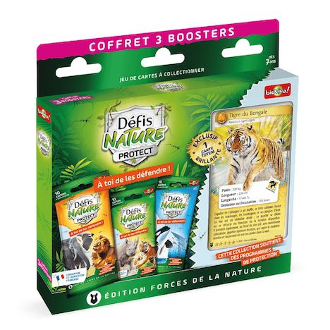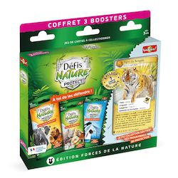 Pariez sur les points forts de vos animaux pour remporter les batailles et ainsi les protéger. Vous avez réussi à défendre une espèce menacée ? Vous remportez des points supplémentaires ! Utilisez vos cartes Pouvoir pour tenter de renverser la situation. contient 3 Boosters de 10 cartes aléatoires 1 carte totem exclusive brillante Tigre du Bengale 1 poster surprise 1 poster surprise pour suivre ta collection !