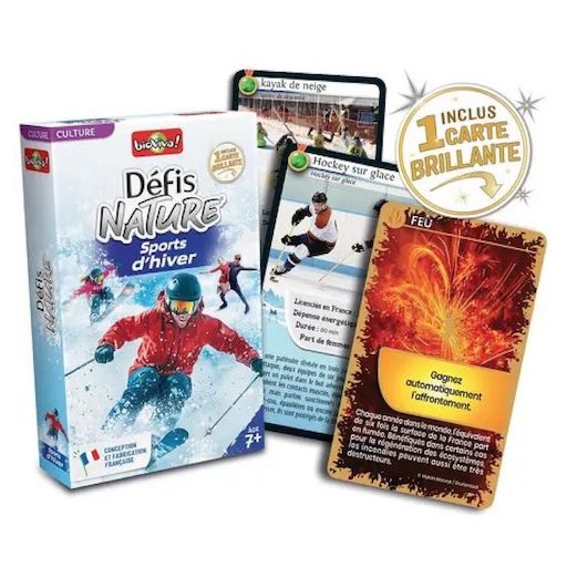 Partez à la découverte des sports d'hiver les plus emblématiques du monde et pariez sur leurs points forts pour gagner la bataille ! Alors, prêts à relever le défi ? Caractéristiques : Nombre de licenciés en France - Dépense énergétique ? Durée ? Pourcentage de femmes parmi l'ensemble des licenciés en France Pastille : Ancienneté des sports (avant 1500, entre 1500 et 1700, entre 1700 et 1800, après 1800) De 2 à 6 joueurs. Dès 7 ans. Fabriqué en France de manière éco-responsable.