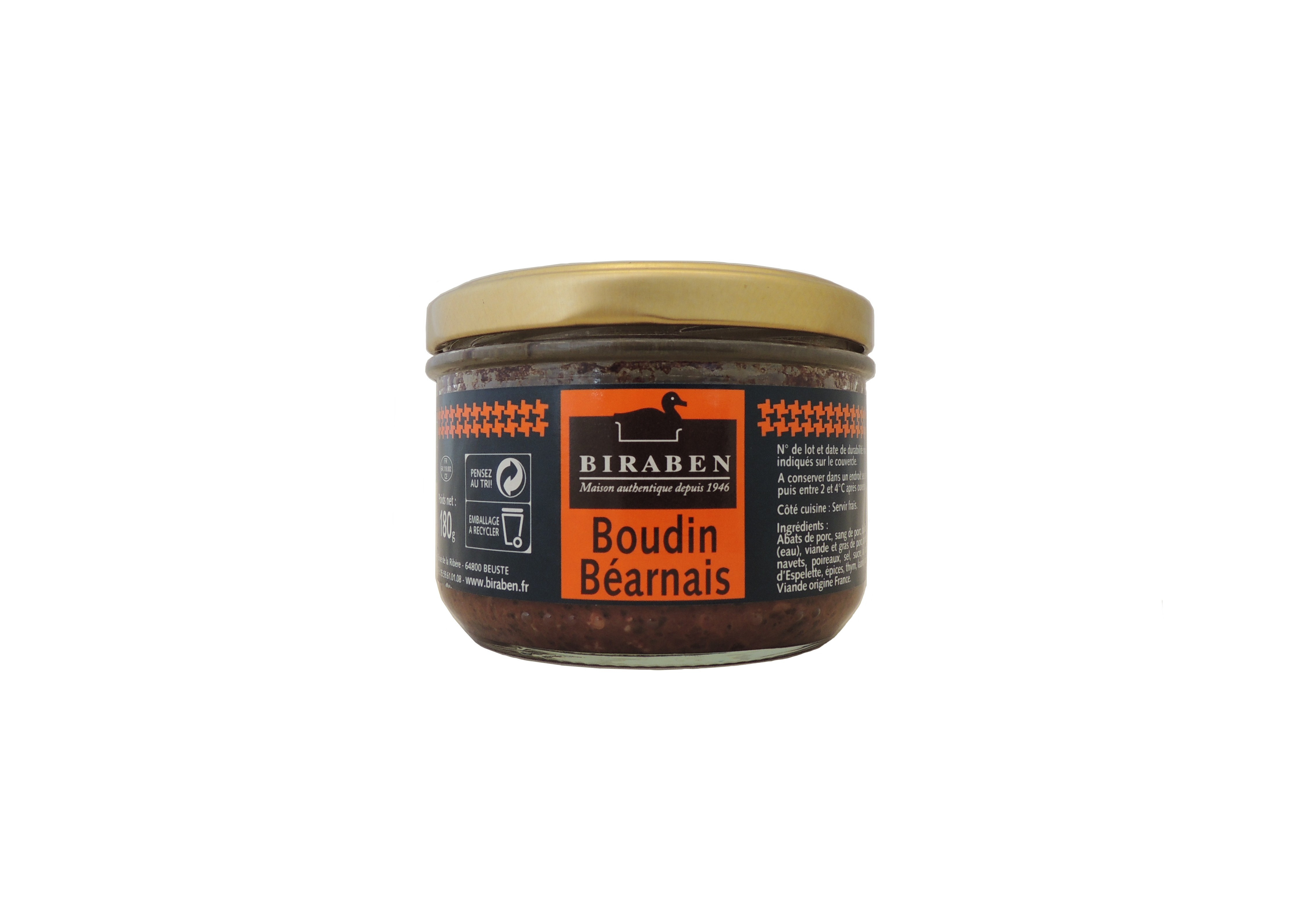 Abats de porc, sang de porc, bouillon de cuisson (eau), viande et gras de porc, carottes, oignons, navets, poireaux, sel, sucre, ail, poivre, piment d’Espelette, épices, thym, laurier. Viande Origine France