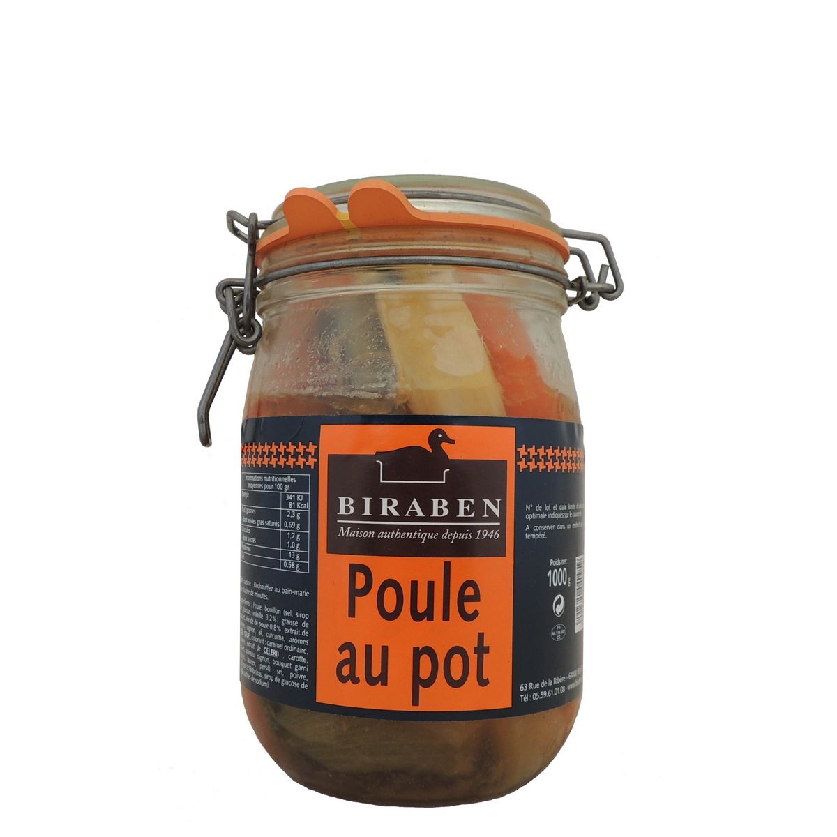 Cuisses de poule origine France, bouillon (eau, maltodextrine, sel, arômes naturels, dextrose, graisse de poulet, plante aromatique), carotte, poireau, navet, oignon, persil, thym, laurier, poivre, concentré (carottes caramélisées et carotte), clous de girofle.