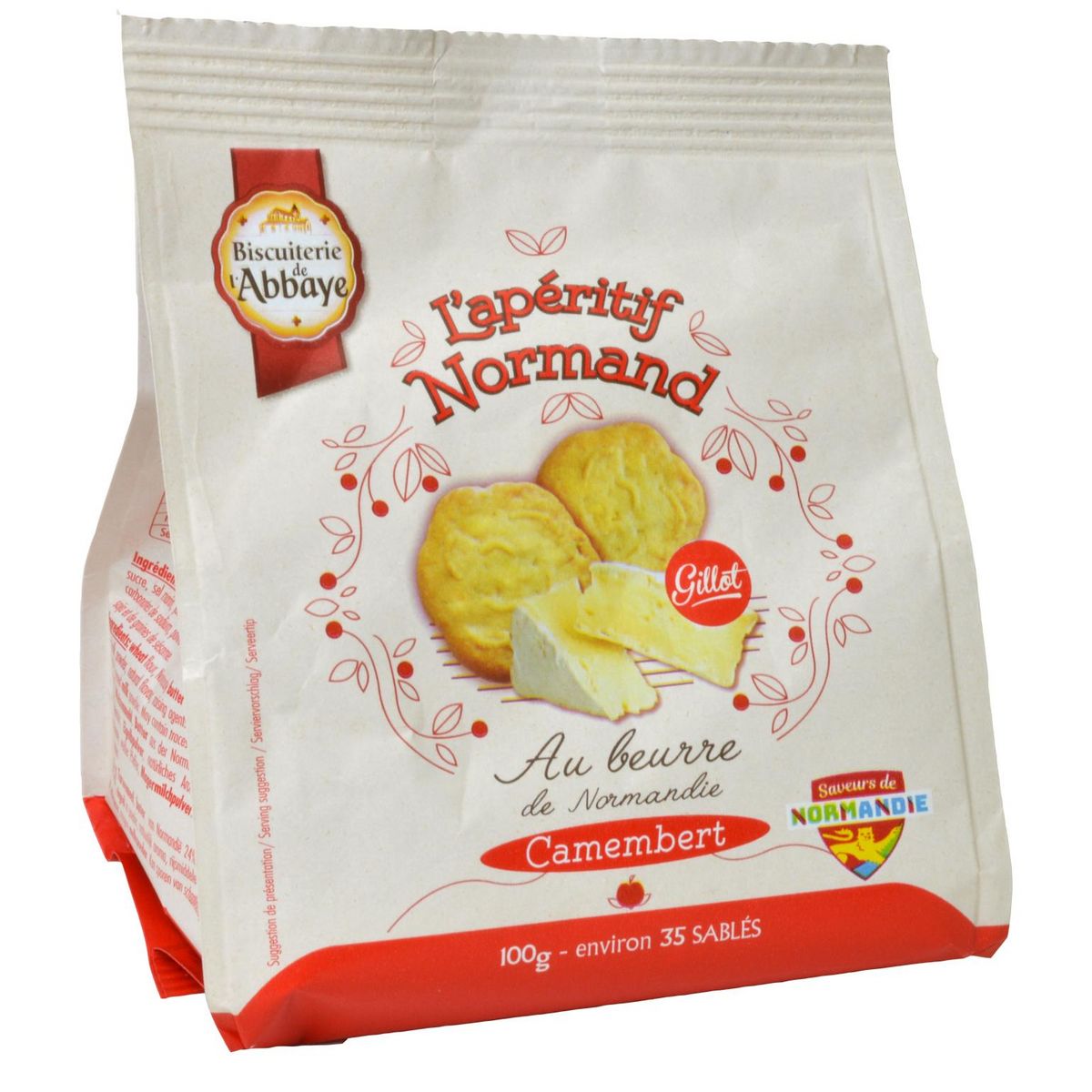 Ingrédients : Farine de BLE CRC®, BEURRE de Normandie 24%, CAMEMBERT 15%, amidon de BLE, sucre, sel marin, jaune d'OEUF en poudre, arôme naturel, poudres à lever : carbonates d’ammonium – carbonates de sodium, poivre blanc, poudre de LAIT écrémé.