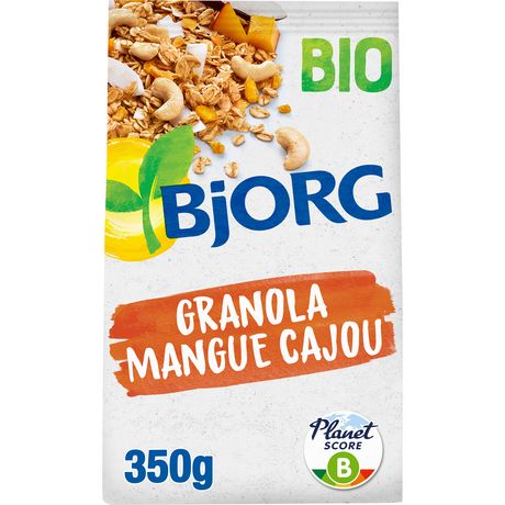 Découvrez le granola mangue cajou Bjorg et faites le plein d'énergie. Bio et riche en fibres, ces céréales sans huile de palme à base d'avoine complète, de mangue, d'éclats de noix de cajou et de copeaux de noix de coco s'intègrent parfaitement dans le cadre d'un petit déjeuner équilibré.