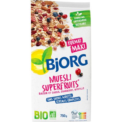 Découvrez le muesli superfruits Bjorg et faites le plein d'énergie. Bio, sans sucres ajoutés (contient des sucres naturellement présents), riche en fibres et à base de céréales complètes, ce muesli composé de 20% de fruits (raisin, cassis, myrtille et cranberry) s'intègre parfaitement dans le cadre d'un petit déjeuner équilibré.