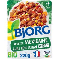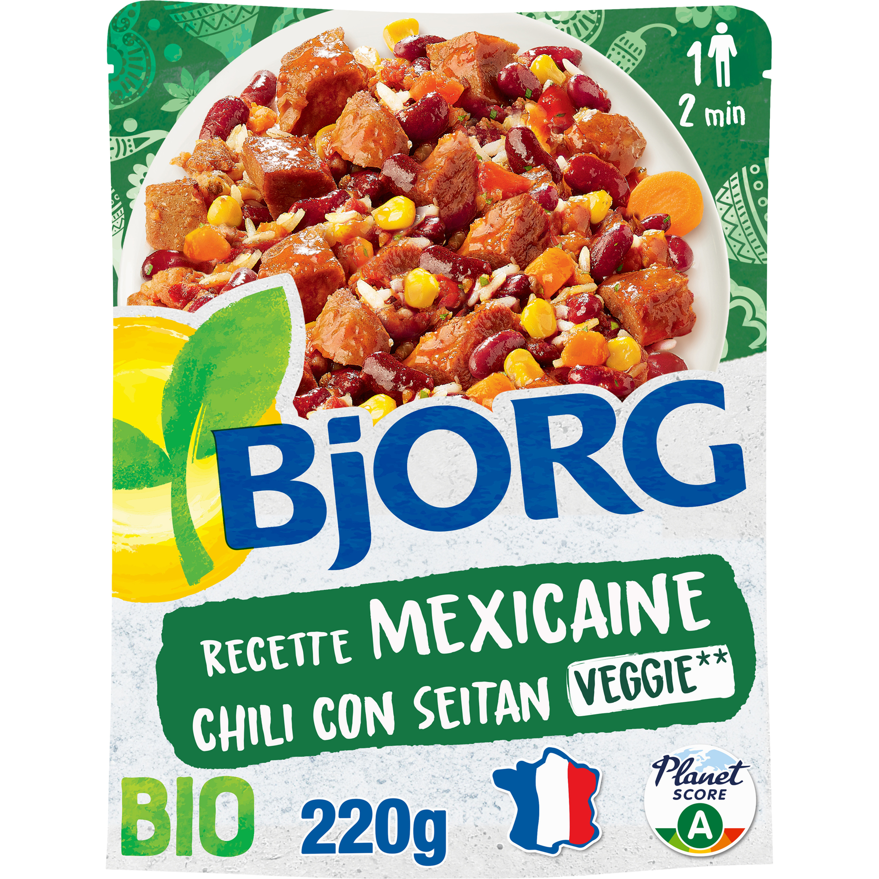 Tomates* 13,8%, haricots rouges* précuits 13,5%, seitan* 11,2% (eau, GLUTEN DE BLÉ*), riz complet* 6%, oignons*, carottes* 3,7%, poivrons rouges*, concentré de tomate* 3,7%, maïs*, huile de tournesol*, amidon de maïs*, sel, ail*, persil*, cumin*, coriandre*, curry*, piment de Cayenne* * Ingrédients biologiques