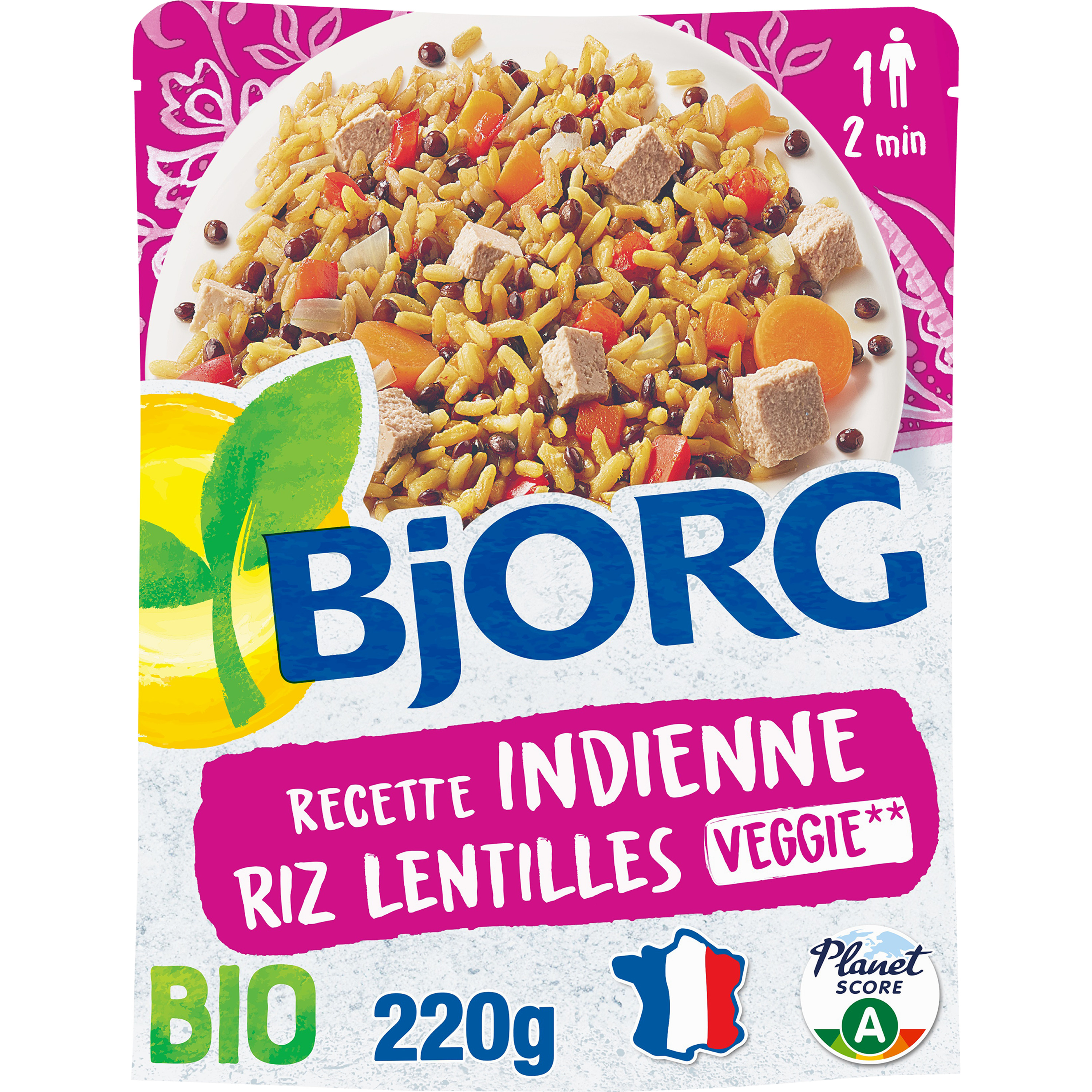 Plat cuisiné biologique préparé à base de riz et lentilles, stérilisé
