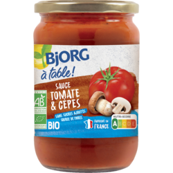 Tomates* 22%, concentré de tomates* 22%, eau, oignons*, champignons* 10,9%, huile de tournesol*, cèpes* 3,5%, ail*, sel, thym*, poivre blanc*