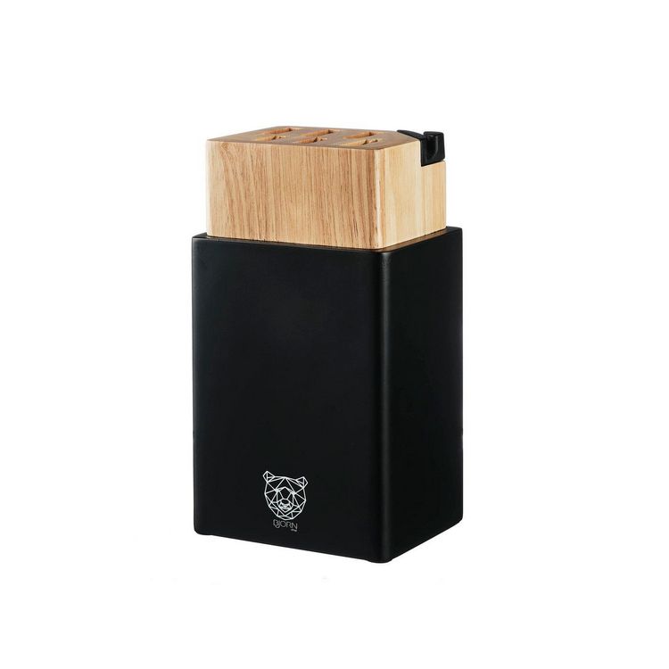 Le design irrésistible du bloc couteaux PORVOO réside le revêtement noir mat au toucher velours qui borde un cube en bois massif. Dans un style ultra moderne, il plaira aux chasseurs de tendances et aux adeptes de qualité durable. Le bois d'hévéa utilisé pour la fabrication de ce bloc est non seulement résistant, mais aussi respectueux de l'environnement, tandis que le revêtement en caoutchouc assure un support stable et antidérapant. Ce bloc couteaux est bien plus qu'un simple support de rangement, il maintient vos couteaux en sécurité et permet un affûtage régulier grâce à son aiguiseur intégré.