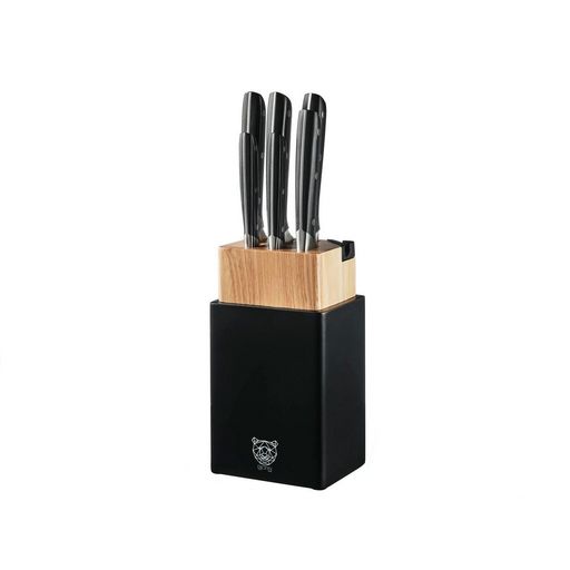 Le set se compose d'un couteau d'office pour couper et peler, d'un couteau universel très polyvalent, d'un couteau santoku pour les herbes aromatiques, les fruits et les légumes (les aliments ne restent pas collés à la lame grâce aux alvéoles), d'un couteau à trancher pour couper les viandes sans les déchirer, d'un couteau à pain permettant de découper des tranches nettes sans en abîmer la croûte et d'un couteau du chef pour les fruits, légumes, viandes ou poissons...