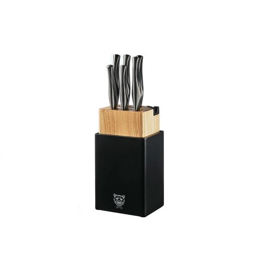 Le design irrésistible du bloc couteaux PORVOO réside le revêtement noir mat au toucher velours qui borde un cube en bois massif. Dans un style ultra moderne, il plaira aux chasseurs de tendances et aux adeptes de qualité durable. Le bois d'hévéa utilisé pour la fabrication de ce bloc est non seulement résistant, mais aussi respectueux de l'environnement, tandis que le revêtement en caoutchouc assure un support stable et antidérapant. Ce bloc couteaux est bien plus qu'un simple support de rangement, il maintient vos couteaux en sécurité et permet un affûtage régulier grâce à son aiguiseur intégré.