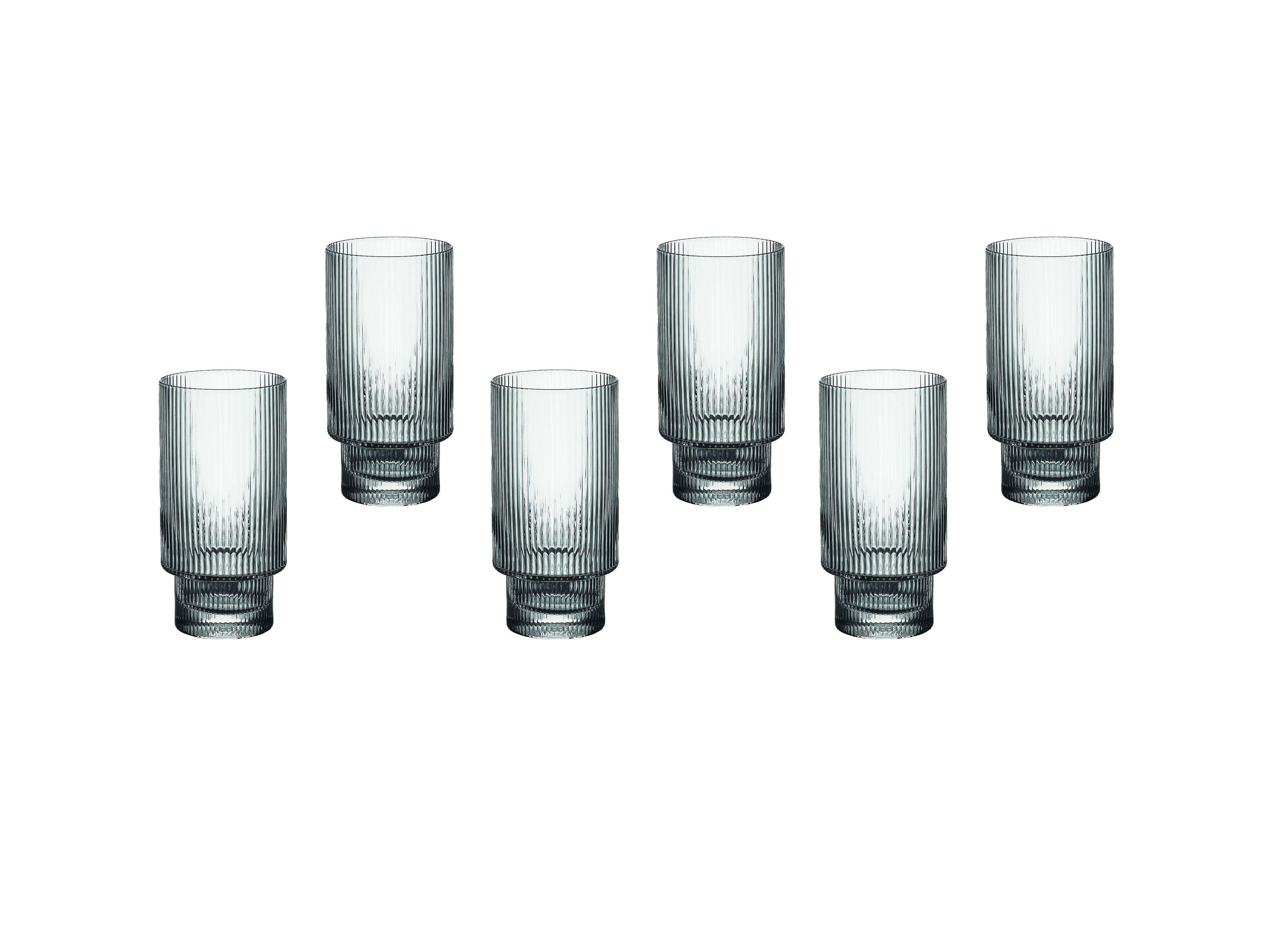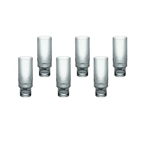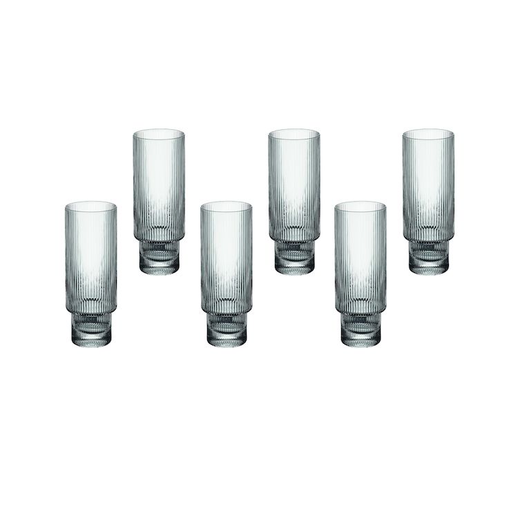 La collection LINJE, qui signifie ligne en suédois, se distingue par ses silhouettes droites, structurées, et par ses reliefs verticaux réguliers qui jouent avec la lumière à chaque mouvement. Les formes sont franches, sans arrondi superflu, et évoquent l'élégance discrète des objets utilitaires bien conçus. La géométrie marquée et les parois striées créent un effet de matière à la fois graphique, minimaliste et tactile. Résolument moderne, chaque verre s'invite aussi bien sur des tables épurées que dans des compositions plus design.