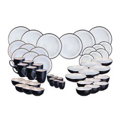 Le service Complet regroupe toutes les pièces de vaisselle de la collection pour une utilisation au quotidien. L'assortiment se compose de 18 assiettes déclinées dans trois tailles différentes, 6 assiettes creuses, 12 bols déclinés dans deux tailles différentes, 6 mugs et 6 tasses pour permettre un dressage de table complet pour 6 personnes.