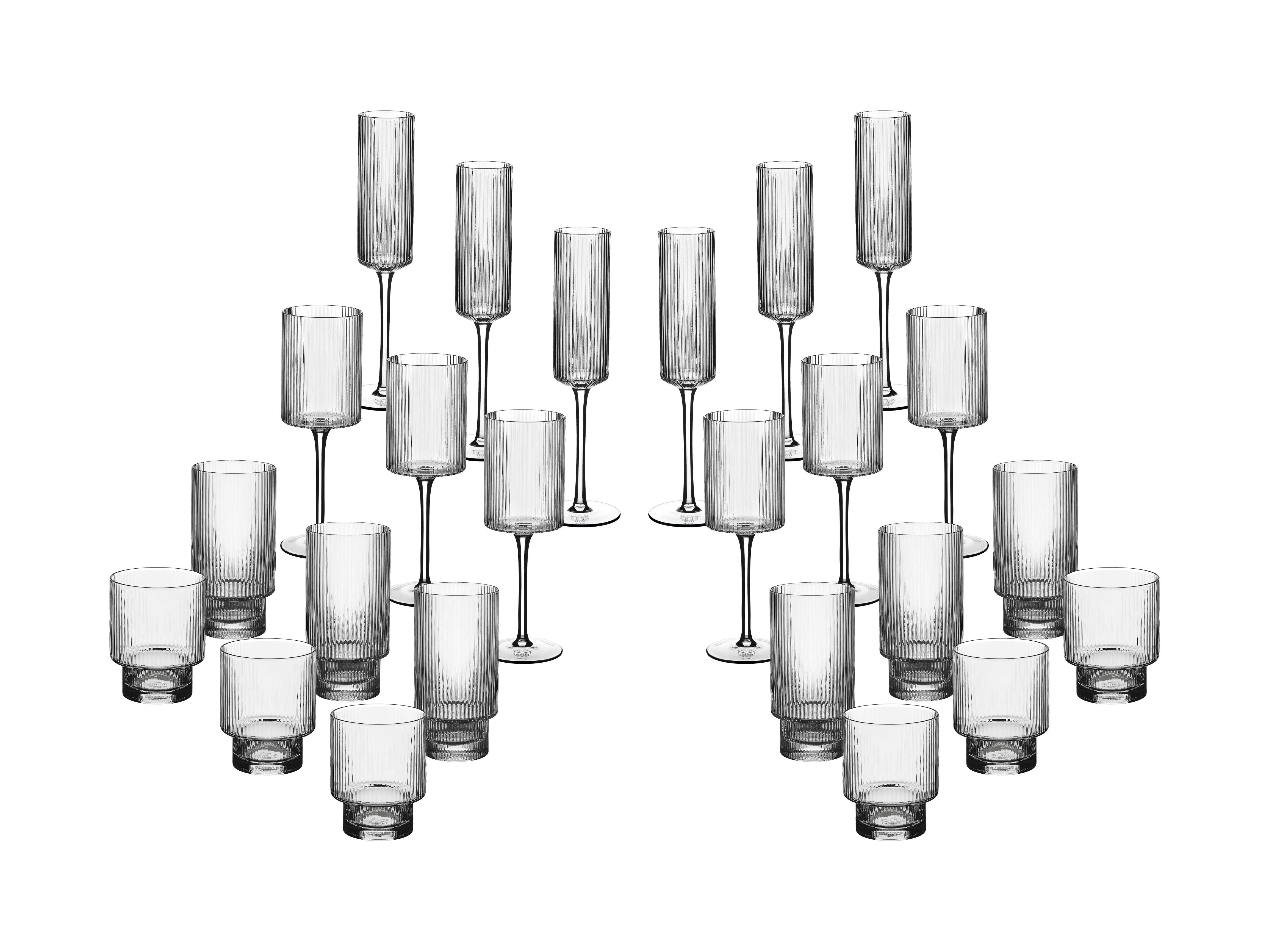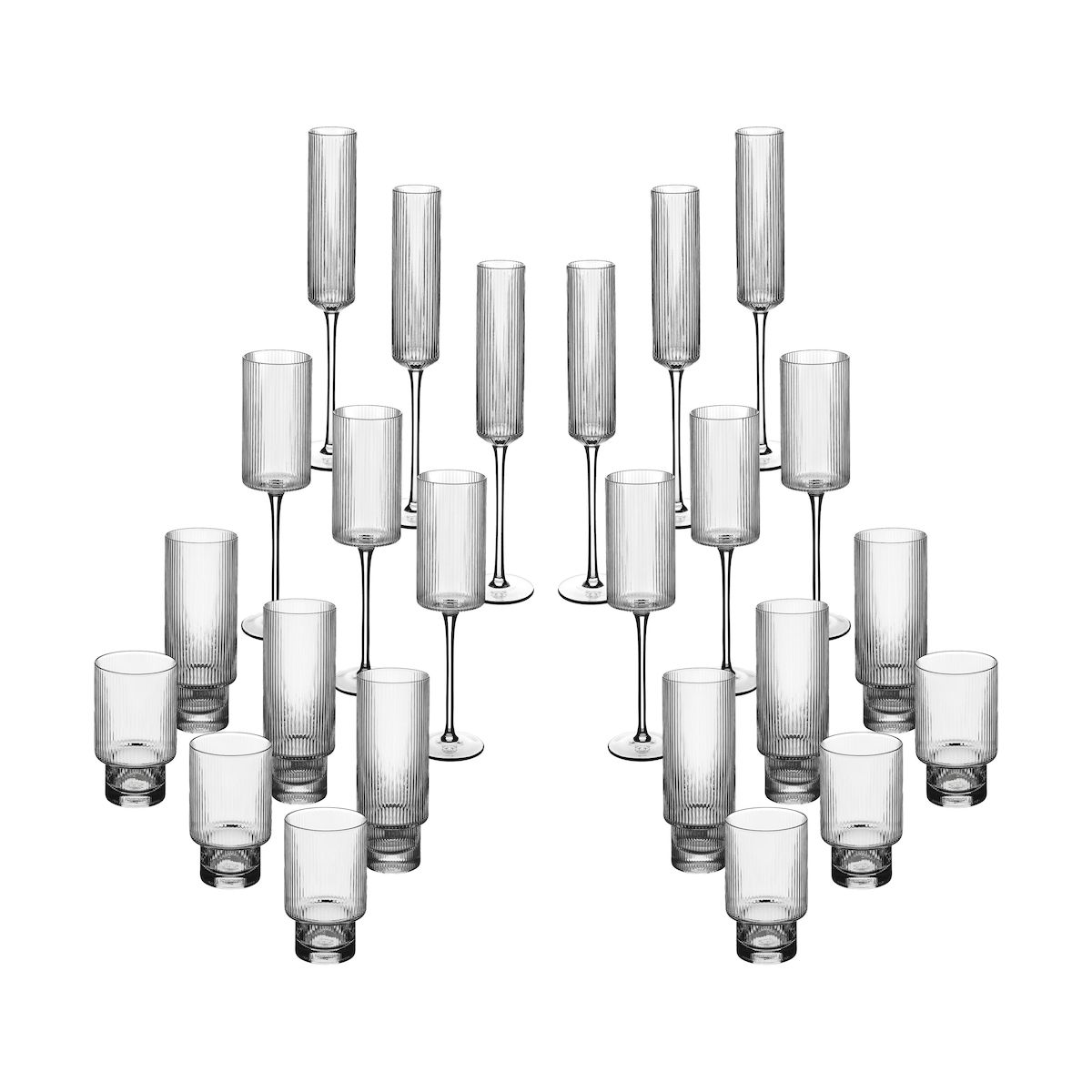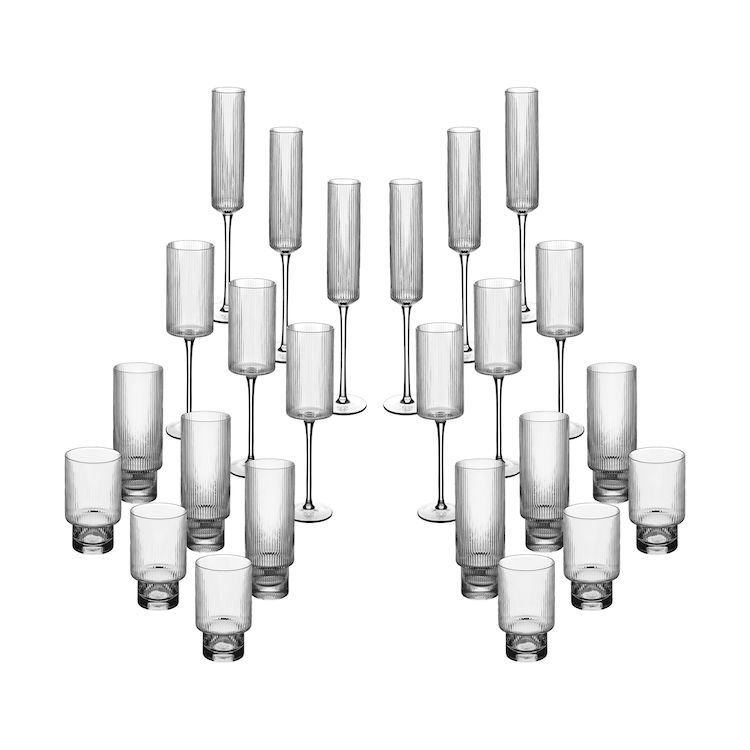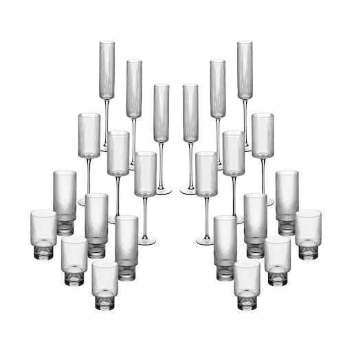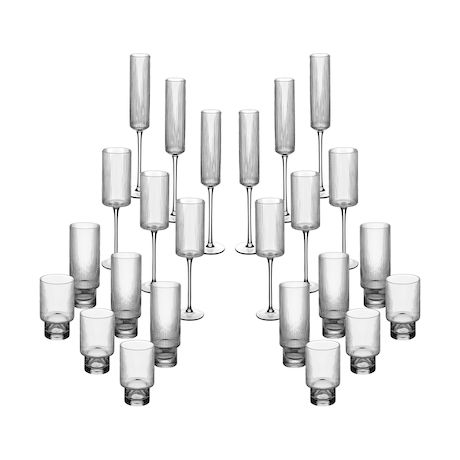 Ce set de 24 verres réunit l'essentiel de la collection LINJE pour composer une table sobre et graphique. Il comprend six gobelets bas de 30 cl, six gobelets hauts de 38 cl, six verres à pied de 32 cl et six flûtes de 20 cl. Chaque forme est pensée pour un usage précis, eau, jus, vin, champagne, tout en partageant la même esthétique rythmée par des lignes verticales. Un ensemble élégant et contemporain, parfait pour une table structurée, lumineuse et pleine de caractère.