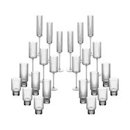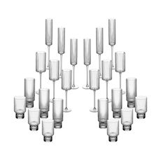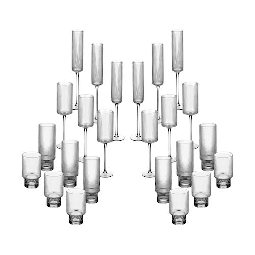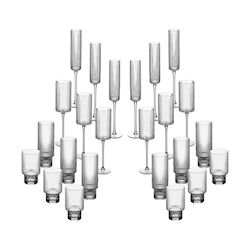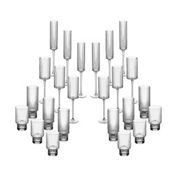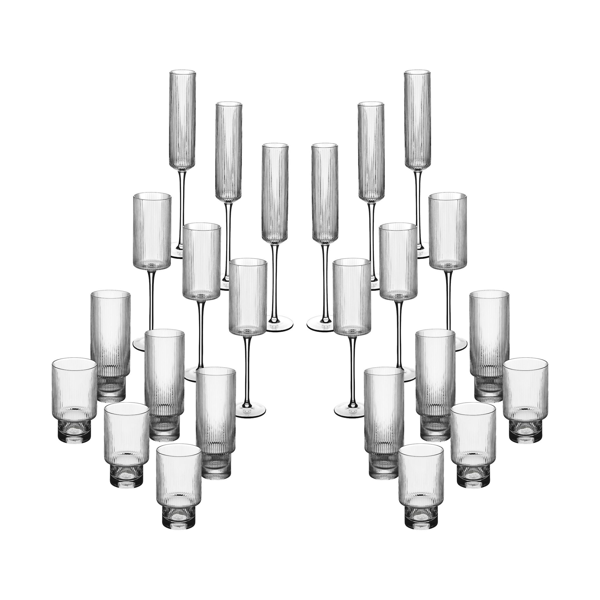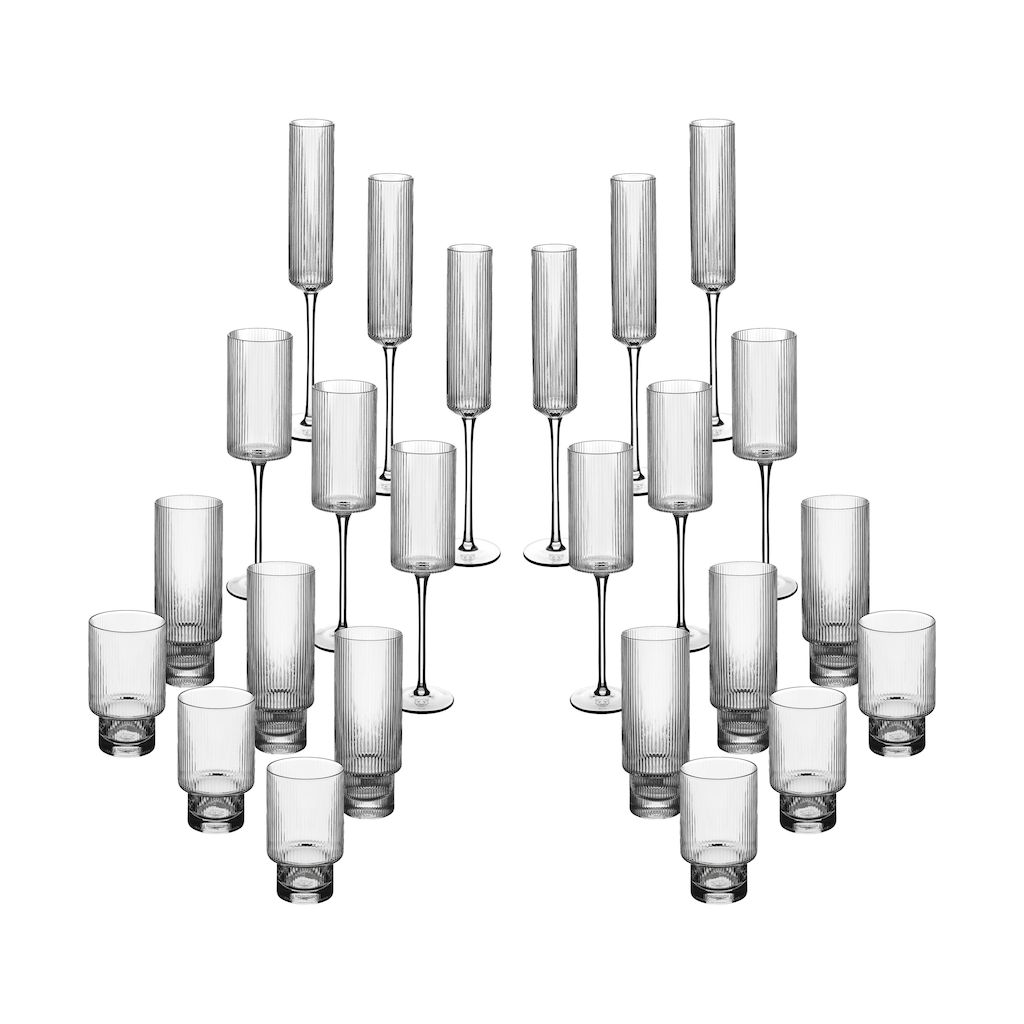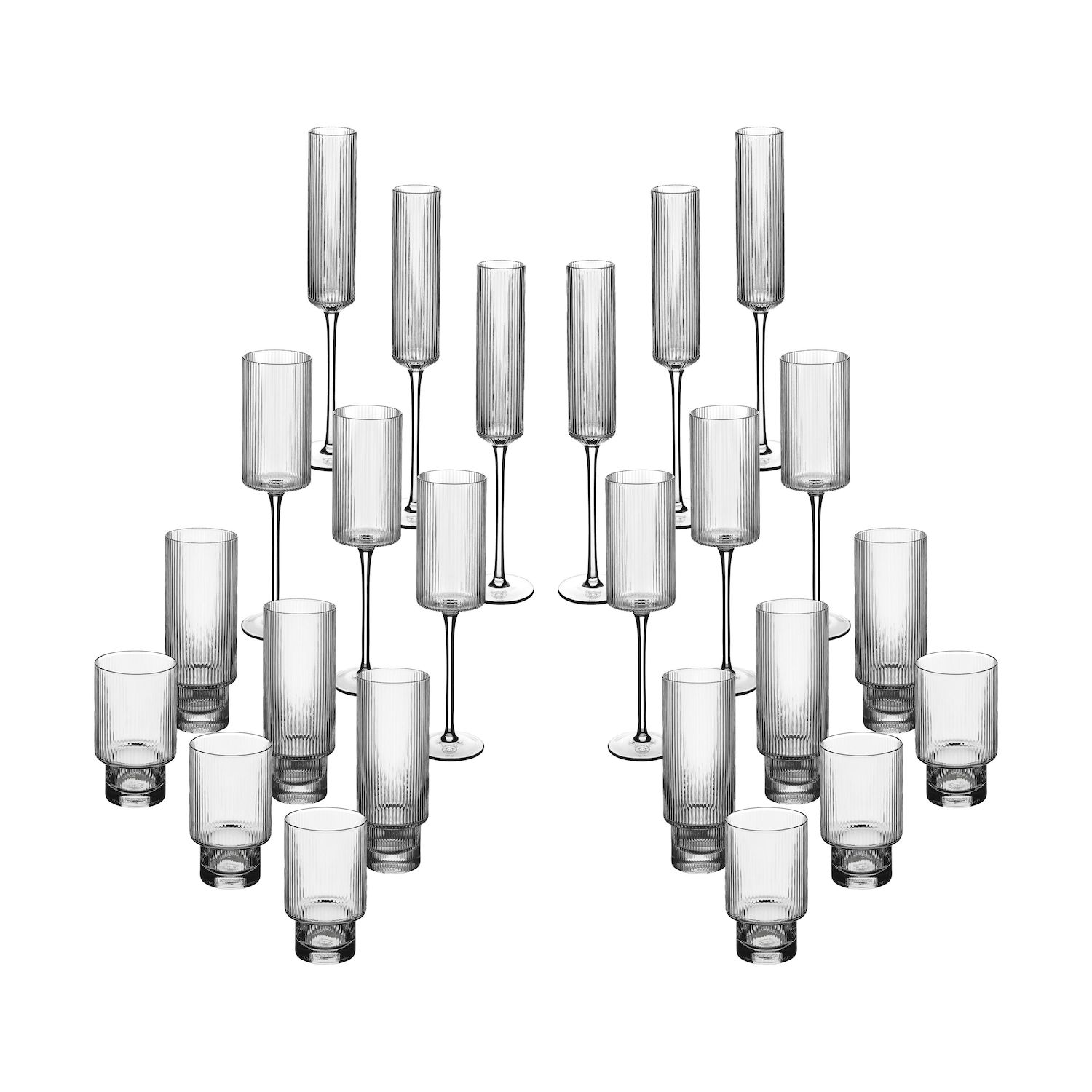 Ce set de 24 verres réunit l'essentiel de la collection LINJE pour composer une table sobre et graphique. Il comprend six gobelets bas de 30 cl, six gobelets hauts de 38 cl, six verres à pied de 32 cl et six flûtes de 20 cl. Chaque forme est pensée pour un usage précis, eau, jus, vin, champagne, tout en partageant la même esthétique rythmée par des lignes verticales. Un ensemble élégant et contemporain, parfait pour une table structurée, lumineuse et pleine de caractère.