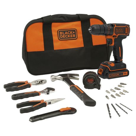 Black and Decker - Perceuse visseuse 18V 1,5Ah Li-Ion avec accessoires et outils à main - Vitesse de travail variable pour un contrôle total pendant le perçage et le vissage - La batterie Li-Ion détient plus de 80% de la charge pendant plus de 90 jours en l'absence d'utilisation. - Un système de supports de batterie rétractables pour un remplacement rapide et facile et une fixation fiable des batteries - Poignées antidérapantes pour une préhension sûre de l'outil pendant le fonctionnement - Perceuse sans fil compacte et légère: idéale pour travailler dans des endroits difficiles d'accès - Contrôle accru du travail pendant le forage dans le bois, le métal, les plastiques et pendant le vissage - LED pour l'éclairage du champ de travail