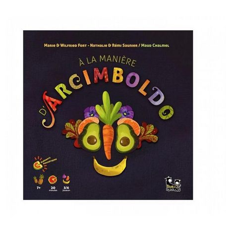 Arcimboldo et ses élèves doivent chacun créer une « ?uvre » à l'aide des éléments de composition magnétiques, fruits, légumes, fleurs et céréales. Ils devront réaliser la meilleure interprétation d'un titre, composé d'un mot et d'un complément, sans contrainte de temps, puis voter pour leur préférée. À la manière d'Arcimboldo, s'inspire des tableaux de Giuseppe Arcimboldo. Les joueurs vont utiliser des fruits, légumes, céréales et fleurs magnétiques pour créer des ?uvres. Ici, pas de stress d'exécution, place à la création !. La partie se déroule en tours. Au début d'un tour, le Maître Arcimboldo prend une demi-étiquette nom, puis une demi-étiquette complément. Il les associe à sa guise, les deux demi-étiquettes étant recto-verso. Une fois la combinaison choisie, le Maître annonce le titre et le place à la vue de tous. Les joueurs vont créer des ?uvres à l'aide des éléments magnétiques, fruits, légumes, céréales et fleurs. Dès qu'un joueur a terminé son ?uvre, il pivote son plateau cadre afin que les autres joueurs puissent la visualiser dans le bon sens. Il est temps pour chacun de commenter son ?uvre en quelques mots en commençant par le Maître Arcimboldo, puis chaque joueur dans le sens des aiguilles d'une montre. Une fois que chacun a commenté son ?uvre, les joueurs votent pour celle qui leur paraît la plus convaincante. Pas de stress d'exécution, place à la création !