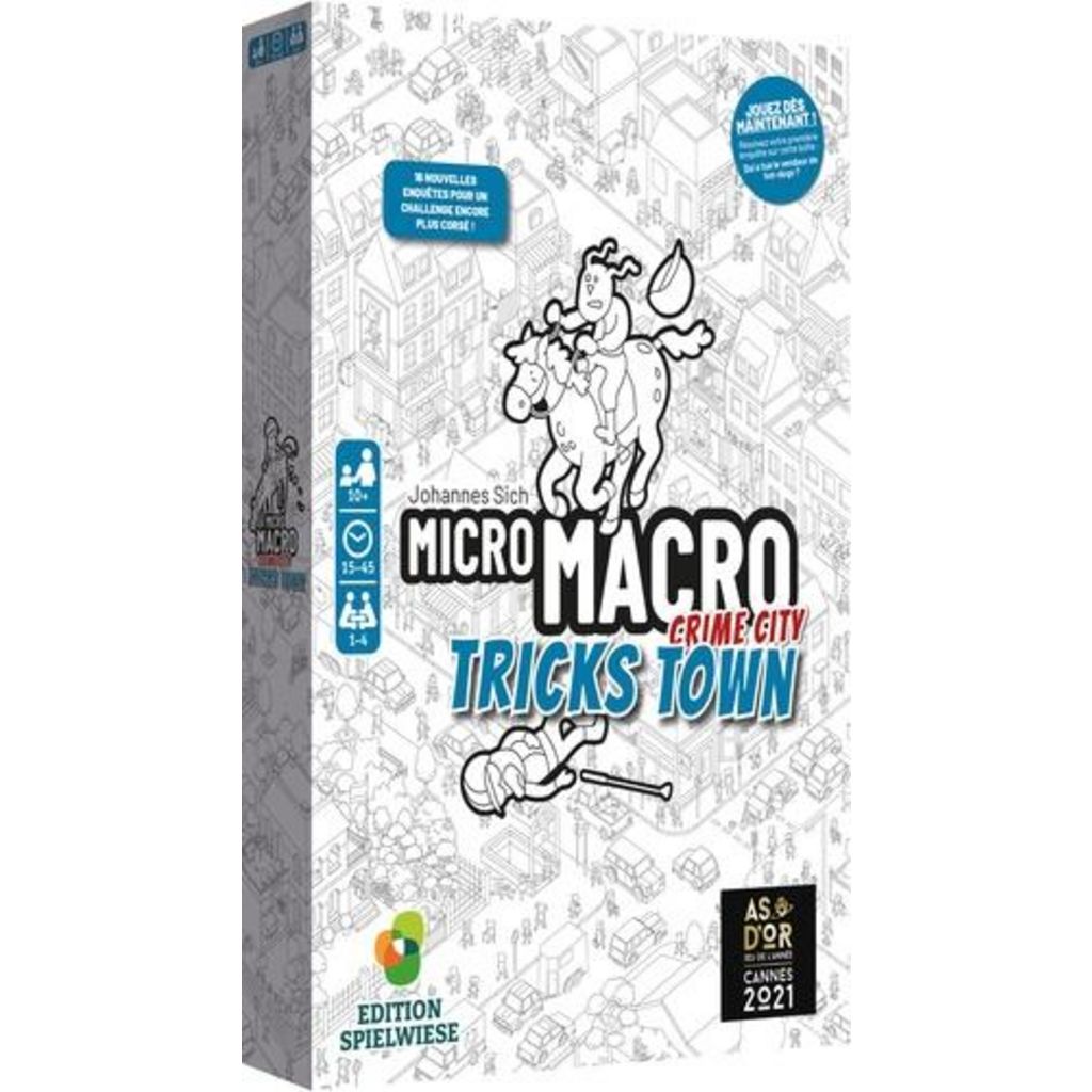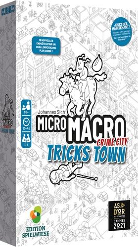 Tricks Town est le troisième volet de la série MicroMacro. Venez y découvrir une nouvelle partie de la ville, avec ses 16 enquêtes inédites et plus corsées à mener. Ce jeu est indépendant des premiers volets : il n‘est pas nécessaire de posséder ou d‘avoir joué aux épisodes précédents pour vous lancer dans ces nouvelles affaires ! MicroMacro est un jeu coopératif. Un œil affûté et un sens de la déduction aiguisé seront vos meilleurs atouts pour coincer les criminels les plus retors ! Les joueurs incarnent des détectives qui devront résoudre des affaires criminelles en observant le plan de la ville. Ils choisissent une enquête et retournent la première carte qui détaille l'affaire. Prenez ensuite la carte suivante et répondez à la question indiquée. Pour vérifier votre affirmation retournez la carte, la réponse est au dos ! Continuez de répondre aux questions afin de résoudre l'enquête.